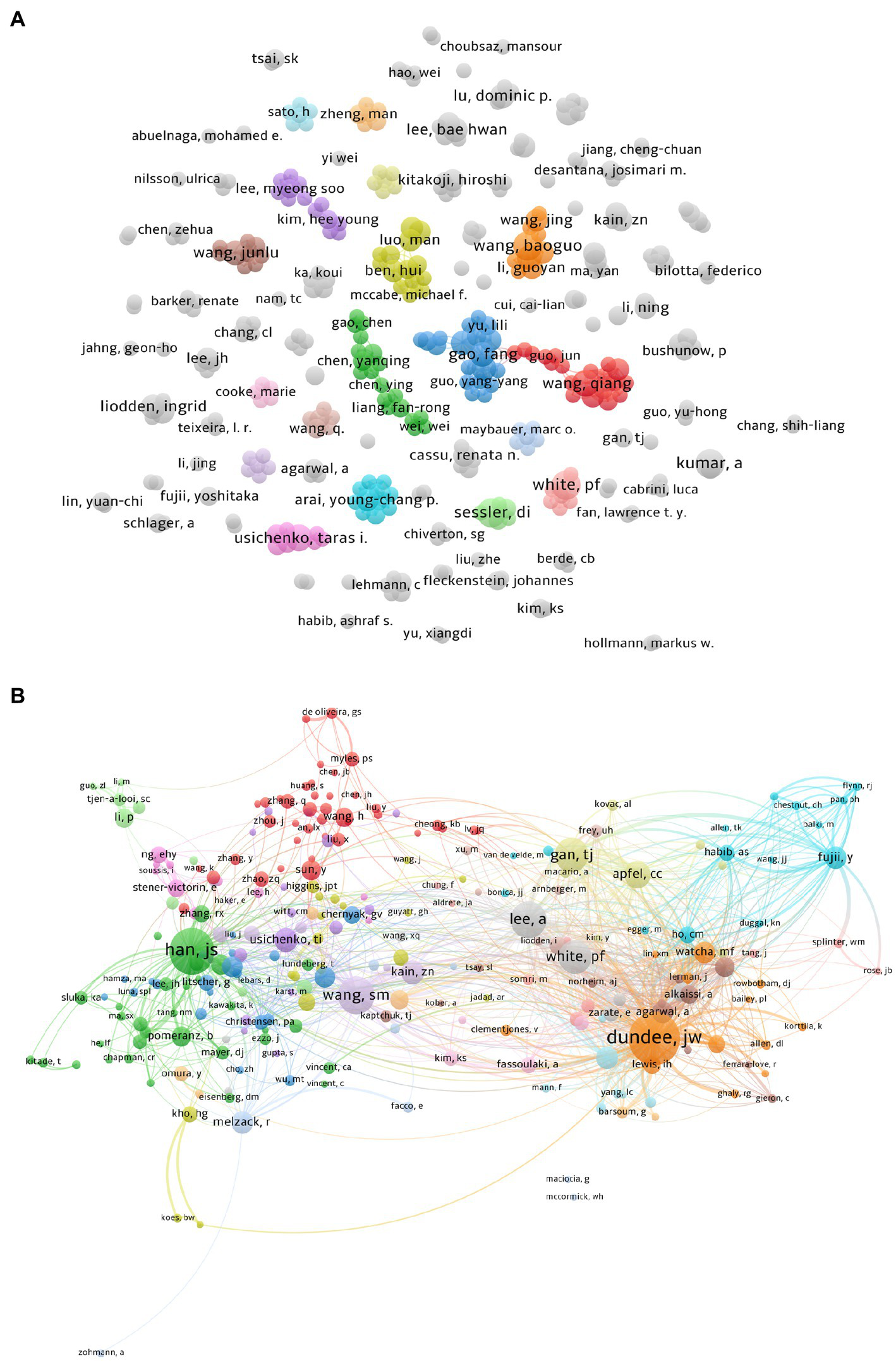 A total of 3,466 authors contributed to these articles; we selected 363 ones with more than two papers for better visualization. We performed the co-occurrence analysis of authors using VOSviewer, resulting in 97 clusters and 687 links (Figure 5A). The relationships between authors can also be observed on this map. In the top 10 authors listed in Table 3. The co-authorship network shows prolific authors and the collaboration among them. The largest number of papers was 7 (Aashish J. Kumar, Daniel I. Sessler, Baoguo Wang and Paul F. White), followed by 6 (Taras I. Usichenko and Qiang Wang). Although many authors have published relevant articles, there was little collaboration among them. Furthermore, the centrality of the authors was relatively low, suggesting that more large-scale, high-quality collaborations are needed in the future.