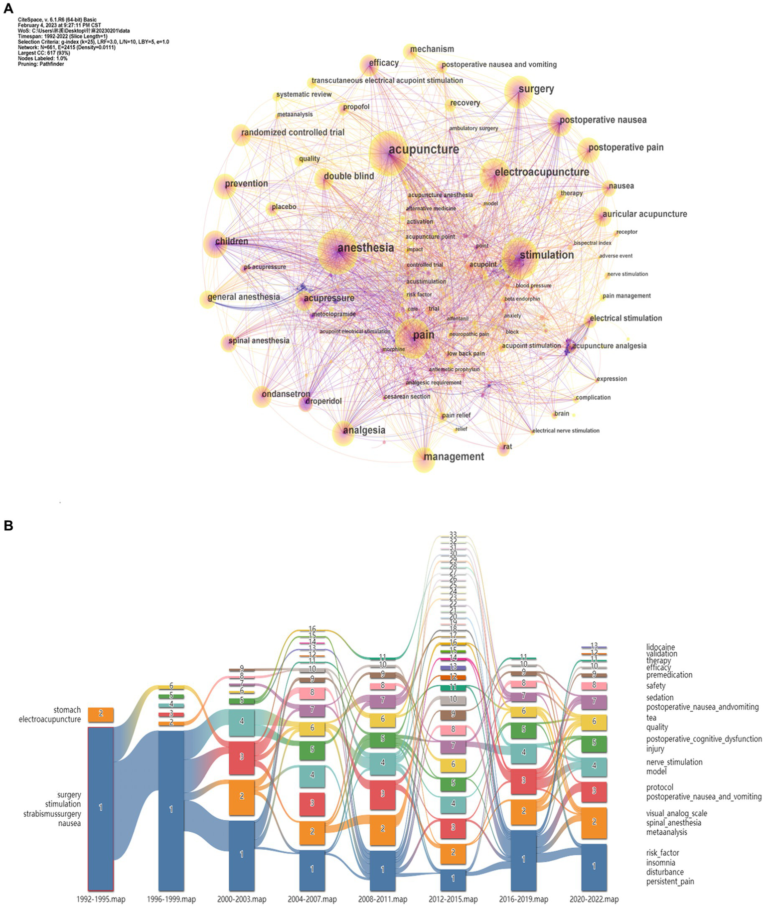 (A) Map of keywords with publications in acupuncture anesthesia. (B) An alluvial diagram illustrating the emergence of acupuncture anesthesia.
