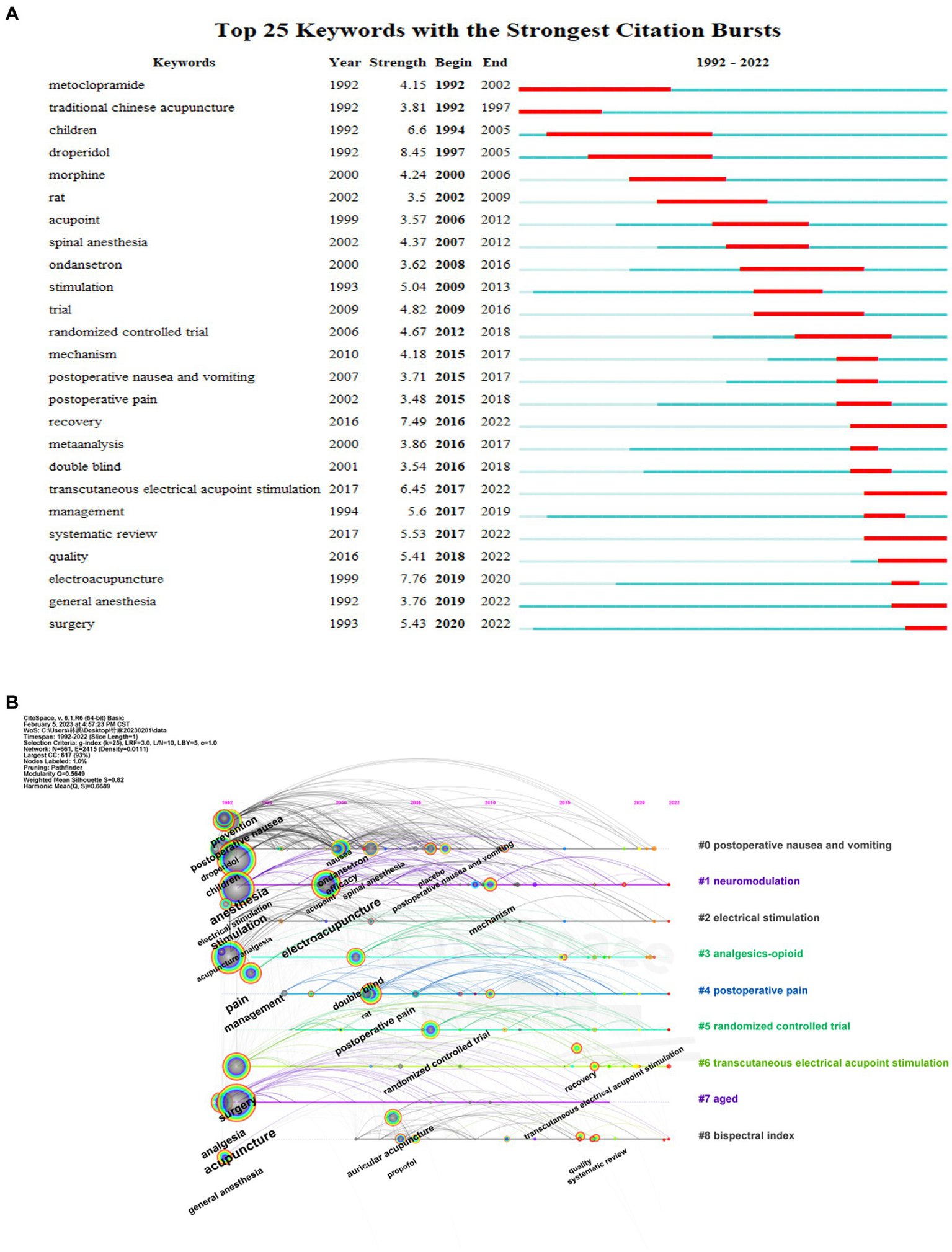 A total of 746 eligible publications were retrieved from the database for the analysis, including 637 articles and 109 reviews. And the trend of annual publications continued to grow. Aashish J. Kumar, Daniel I. Sessler, Baoguo Wang, and Paul F. White published the most papers in this field (7), and all authors, had a very low centrality (<0.01). China (252) and the University of California System (21) were the most productive country (region) and institution, respectively, while the United States (0.62) and University of California System (0.16) had the highest centrality. After removing keywords related to the search strategy, the three most frequent were pain (115), electroacupuncture (109), and stimulation (91). The six most recent burst keywords were recovery, transcutaneous electrical acupoint stimulation, systematic review, quality, general anesthesia, and surgery. Wang et al.’s article had the highest co-citation count (20), whereas Zhang et al.’s articles had the highest centrality (0.25). The Journal of Anesthesia and Analgesia was the most influential one (408 co-citations).