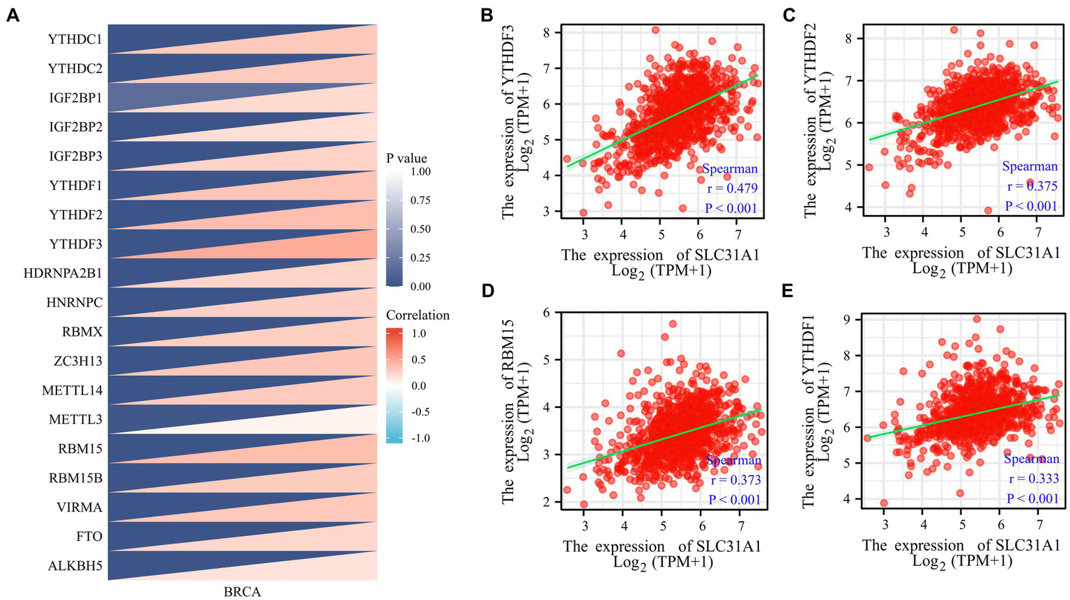 Figure 2. Correlations of the SLC31A1 expression with m6A-related genes in breast cancer based on the TCGA database. (A) Correlation between the expression level of SLC31A1 and m6A-related genes. (B–E) The expression of SLC31A1 was positively associated with YTHDF3 (B), YTHDF2 (C), RBM15 (D), and YTHDF1 (E). Spearman’s rank correlation coefficient was applied for correlation analysis.