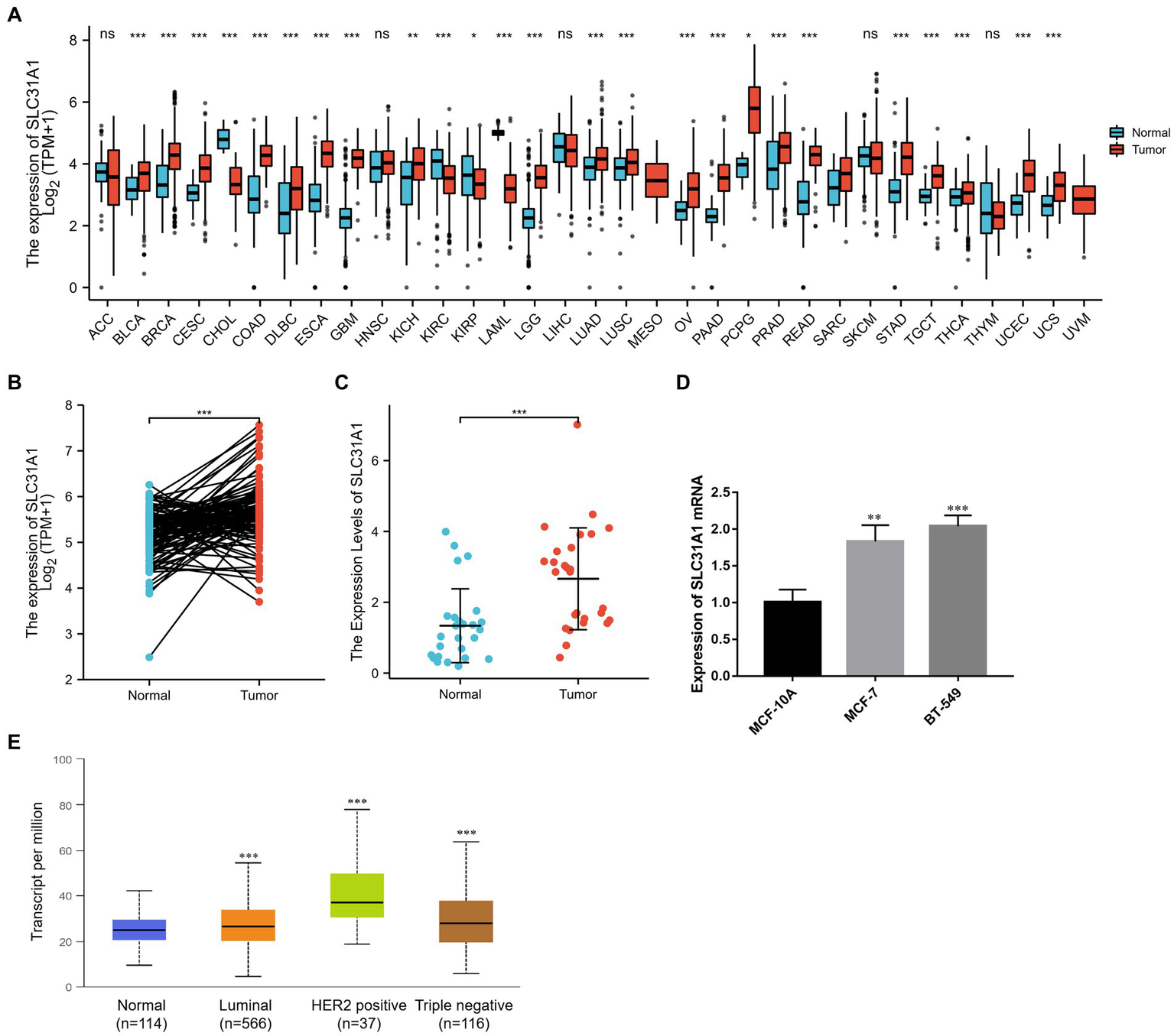 Differential expression of SLC31A1 in breast cancer (BRCA). (A) SLC31A1 mRNA expression in pan-cancer tissues compared to normal tissues based on the TCGA database. (B) SLC31A1 mRNA expression of tumor tissues in BRCA compared to pairwise normal tissues based on TCGA database. (C) The mRNA expression level of SLC31A1 is higher in breast cancer tissues (n = 27) than in paired normal breast tissues (n = 27). (D) SLC31A1 mRNA expression in different breast cancer cell lines (MCF-7 and BT-549) and human mammary epithelial cells (MCF-10A). (E) SLC31A1 mRNA expression in different breast cancer molecular subtypes. The t-test was used to compare the expression differences between the two groups. *p < 0.05, **p < 0.01, and ***p < 0.001.