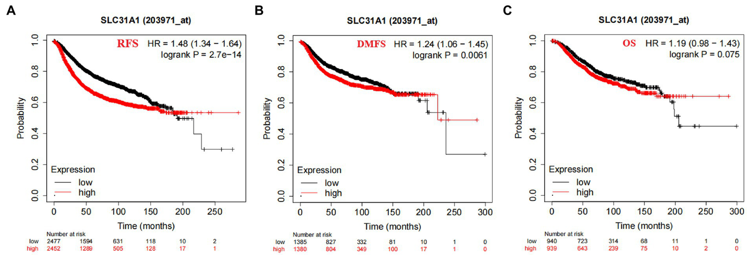 Correlation of SLC31A1 mRNA expression and survival in breast cancer from the Kaplan–Meier Plotter website. (A) The Kaplan–Meier curve of the relapse-free survival (RFS) probability in 203971_at breast cancer cohort. (B) The Kaplan–Meier curve of the distant metastasis-free survival (DMFS) probability in 203971_ at the breast cancer cohort. (C) The Kaplan–Meier curve of the overall survival (OS) probability in 203971_ at the breast cancer cohort.