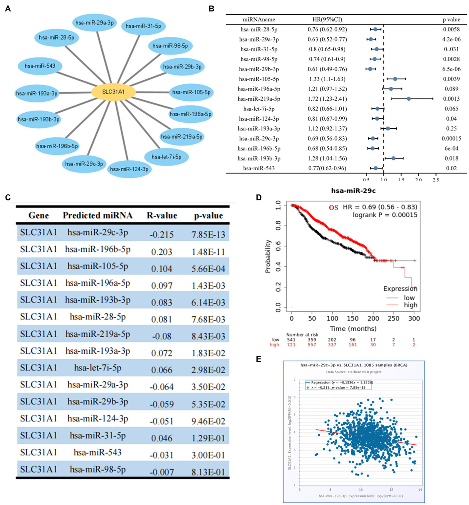Figure 5. Identification of upstream potential miRNA of SLC31A1 in breast cancer. (A) miRNA-SLC31A1 network constructed by Cytoscape software. (B) Prognostic analysis (overall survival, OS) of potential upstream miRNAs of SLC31A1 in breast cancer using forest plots. (C) Expression correlation between predicted miRNAs and SLC31A1 in breast cancer using starBase database. (D) Overall survival (OS) analysis for hsa-miR-29c-3p in breast cancer. (E) Scatter plot about the correlation between the expression of SLC31A1 and hsa-miR-29c-3p in breast cancer obtained from the starBase database.