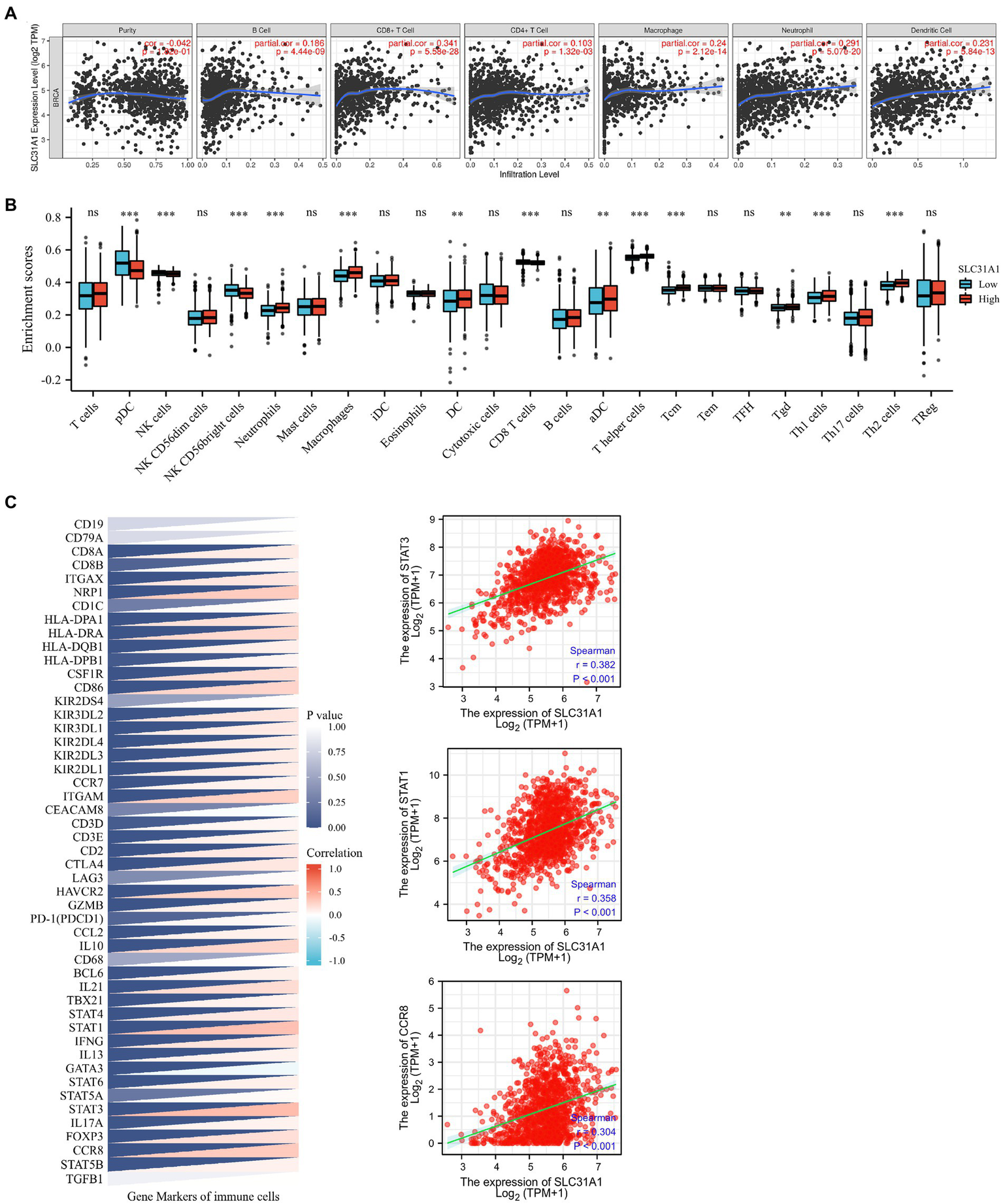 Figure 7. Correlations of the SLC31A1 expression with immune cells infiltration and immune markers in breast cancer. (A) The expression of SLC31A1 was significantly correlated with infiltrating levels of B cells, CD8 + T cells, CD4 + T cells, macrophages, neutrophils, and dendritic cells in breast cancer. The SLC31A1 expression levels against tumor purity adjustment are displayed on the left-most panel. (B) The difference in enrichment scores of 24 immune cell types between the SLC31A1 high and low expression groups. (C) Correlation between SLC31A1 and immune markers of various tumor immune infiltration cells in breast cancer. The t-test is used to compare the expression differences between the two groups. *p < 0.05, **p < 0.01, ***p < 0.001.