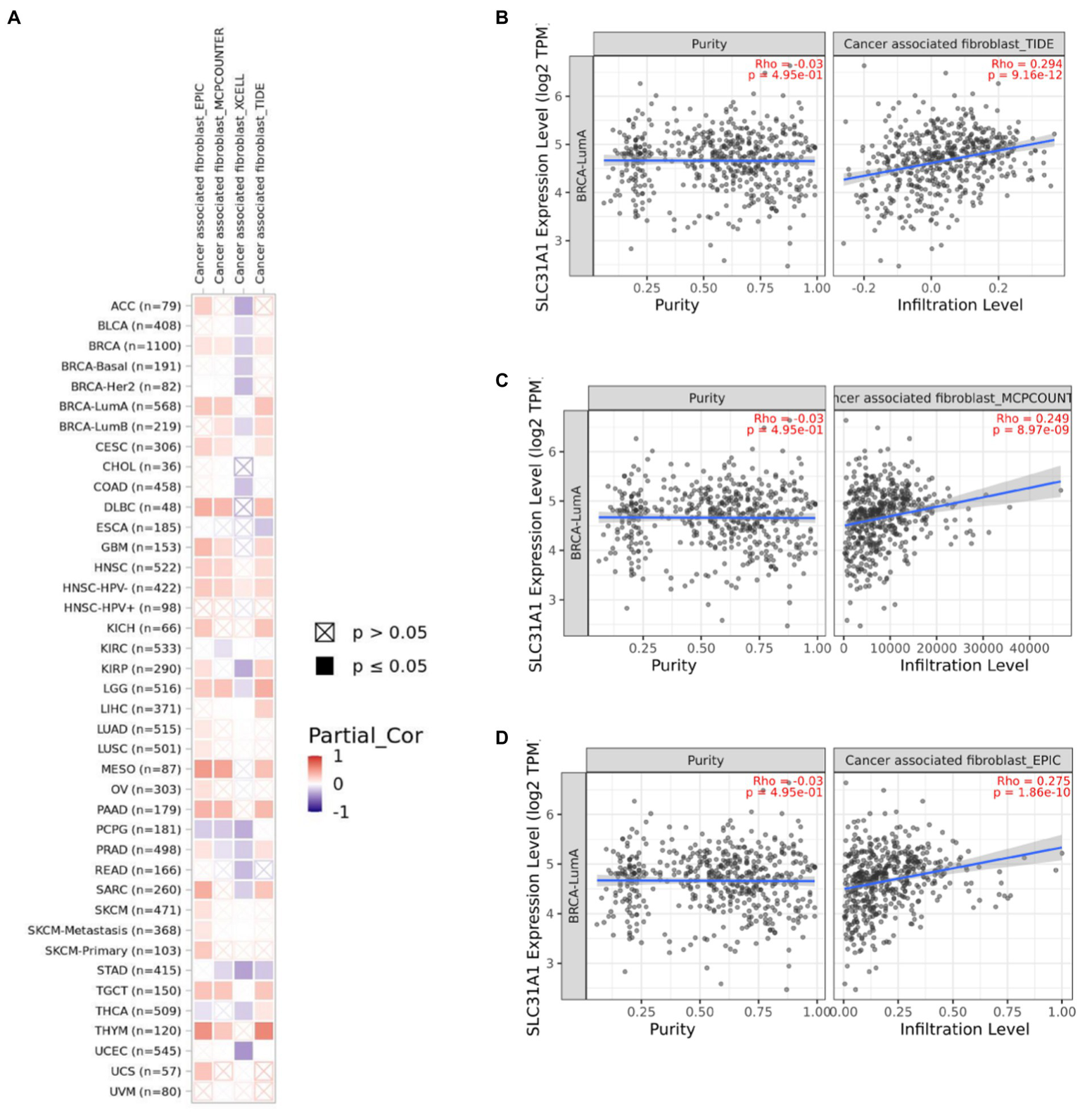 The Tumor Immune Estimation Resource (TIMER)8 was used for a comprehensive analysis of tumor-infiltrating immune cells in our study. Several researchers have suggested that tumor-infiltrating lymphocytes(TILs) were evaluated as a prognostic feature in multiple molecular subtypes of BRCA (12–14). Our study attempted to analyze the associations and prognosis between immune infiltrate cells (CD8+ T cells, CD4+ T cells, B cells, dendritic cells, macrophages, and neutrophils) and SLC31A1 expression by the TIMER website. In addition, we analyzed the correlation between the expression level of SLC31A1 in BRCA and the immune marker. A recent study has shown that cancer-associated fibroblast(CAF)plays a vital role in cancer progression and immunity (15). CAF is a stromal component that constitutes the tumor microenvironment (TME). To evaluate the role of SLC31A1 in the tumor microenvironment, we analyzed the correlation between the SLC31A1 expression and CAF in pan-cancer by the TIMER 2.0 website9.
