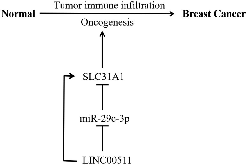 MicroRNAs (miRNAs) are a class of evolutionarily highly conserved small non-coding RNAs and primarily affect gene expression levels via targeting mRNA (31). Growing research suggested that miRNAs contribute to cancer progression by regulating target genes (32–34). Our study supported that miR-29c-3p is the most potentially binding miRNA of SLC31A1. Correlation analysis suggested a strongly negative relationship between SLC31A1 and hsa-miR-29c-3p. The hsa-miR-29c-3p-SLC31A1 axis was considered as the potential pathway involved in the progression of breast cancer by regulating copper transport. Kong et al. suggested that lncRNA-CDC6 promotes breast cancer progression and functions as ceRNA to target CDC6 by sponging microRNA-215 (20). A recent study from Lou et al. showed that RP11-480I12.5–004 promoted growth and tumorigenesis of breast cancer by competitively binding to miR-29c-3p (35). These studies suggested that lncRNA serves as a ceRNA to regulate the expression of target genes in cancer via sponging miRNA. Our study further predicted the upstream potential lncRNAs of hsa-miR-29c-3p. As shown in Figure 6F analysis, LINC00511 was considered the most potential lncRNA upstream of hsa-miR-29c-3p. Through comprehensive analysis of lncRNA, miRNA, and mRNA expression, we constructed a ceRNA network and named it the LINC00511/miR-29c-3p/SLC31A1 axis (Figure 9). The LINC00511/miR-29c-3p/SLC31A1 axis may promote invasion and metastasis in breast cancer through the regulation of copper transport.