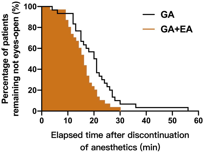The emergence time from anesthesia was significantly shorter in the GA + EA group [16.0 (IQR: 11.0–19.3) min] compared with the GA alone group [20.5 (IQR: 14.5–25.3) min] using the Kaplan–Meier log-rank survival analysis (p = 0.013). The cumulative percentages of patients remaining unconscious after discontinuation of anesthetics infusion for both groups are shown in Figure 3.