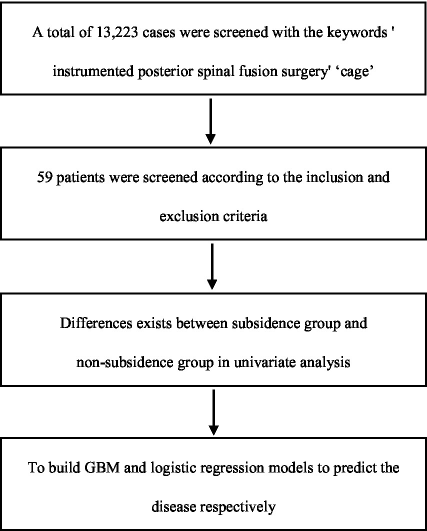 This study reviewed 59 patients who underwent posterior lumbar fusion in our hospital from 2014 to 2019. They were divided into a subsidence group and a non-subsidence group according to whether the interbody fusion cage subsidence occurred during follow-up. Data were collected on the patient, including age, sex, cage segment, number of fusion segments, preoperative space height, postoperative space height, preoperative L4 lordosis Angle, postoperative L4 lordosis Angle, preoperative L5 lordosis Angle, postoperative PT, postoperative SS, postoperative PI. The conventional statistical analysis method was used to find potential risk factors that can lead to subsidence, then the results were incorporated into stepwise regression and machine learning algorithms, respectively, to build a model that could predict the subsidence. Finally the diagnostic efficiency of prediction is verified.