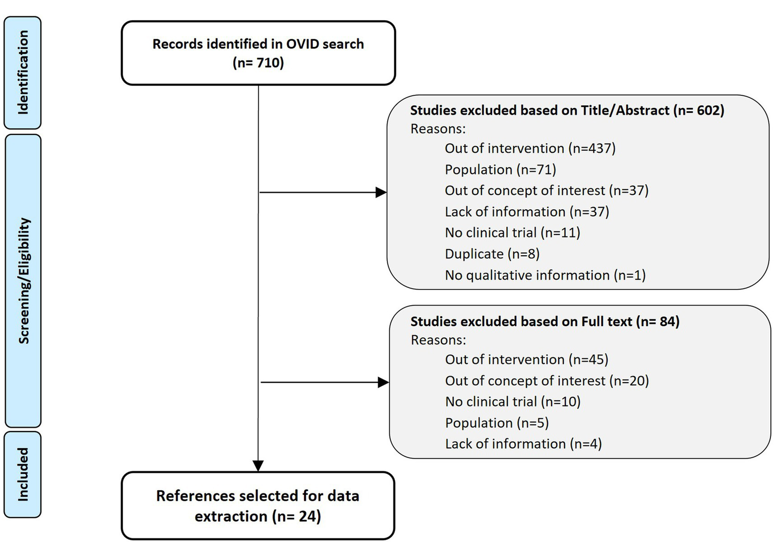 Searches of in-trial interview studies published between January 2011 and February 2022 was conducted in Medline and Embase databases (via OVID platform) using Thesaurus, MeSH, and free text terms (See Search Strategy in Table 1). The search retrieved 710 references that were reviewed and selected according to the PICOS criteria (8). Although specific therapeutic indications were initially included, the selection was extended to chronic and non-oncologic diseases if the outcome around the use and impact of in-trial interviews was discussed (Figure 2).
