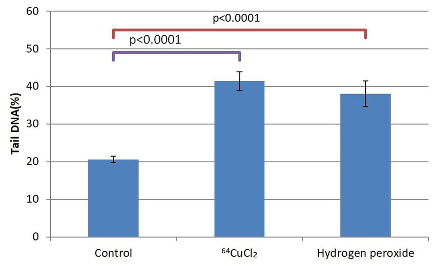 Whenever possible, data were presented as mean value ± standard error of the mean (SEM) for triplicate samples. Comparison between triplicate samples treated with the [64Cu]CuCl2 solution and triplicate untreated controls was performed with the Student’s t-test. For the comet assay, due to data dispersion, we selected the P25-P75 interval for statistical analysis. Given the fact that the comet assay data were not normally distributed according to the Shapiro–Wilk test, the Mann–Whitney U test was used to compare samples treated with 64CuCl2 or H2O2 and untreated controls. Differences between treated samples and controls were considered significant for p values <0.05. The half maximal effective activity (EC50) was calculated using the online calculator freely provided by AAT Bioquest (36).