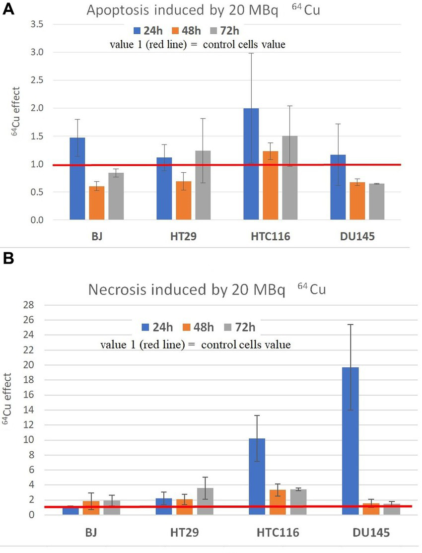 Apoptosis (A) and necrosis (B) induced by 20 MBq/mL 64Cu in normal human BJ fibroblasts and various human tumor cells (HT29 and HCT116 colon carcinoma, and DU145 prostate carcinoma cells). Apoptosis and necrosis were evaluated by fluorescent microscopy with acridine orange and ethidium homodimer-1. Results are expressed as mean ± SEM of the 64Cu effect on the percentage of apoptotic or necrotic cells for 2 independent experiments. The mean effect was calculated in each experiment as parameter value in exposed cells divided by the parameter value in unexposed control cells, and was further used for the statistics of 2 independent experiments.