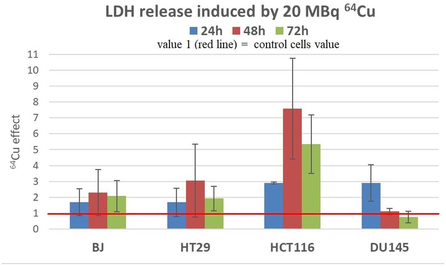 LDH release induced by 20 MBq/mL 64Cu in cultures of normal human BJ fibroblasts and various human tumor cells (HT29 and HCT116 colon carcinoma and DU145 prostate carcinoma cells). Results are expressed as mean ± SEM of 64Cu effect on the percentage of apoptotic or necrotic cells for 2 independent experiments. The mean effect was calculated in each experiment as parameter value in exposed cells divided by the parameter value in untreated controls, and was further used for the statistics of 2 independent experiments.