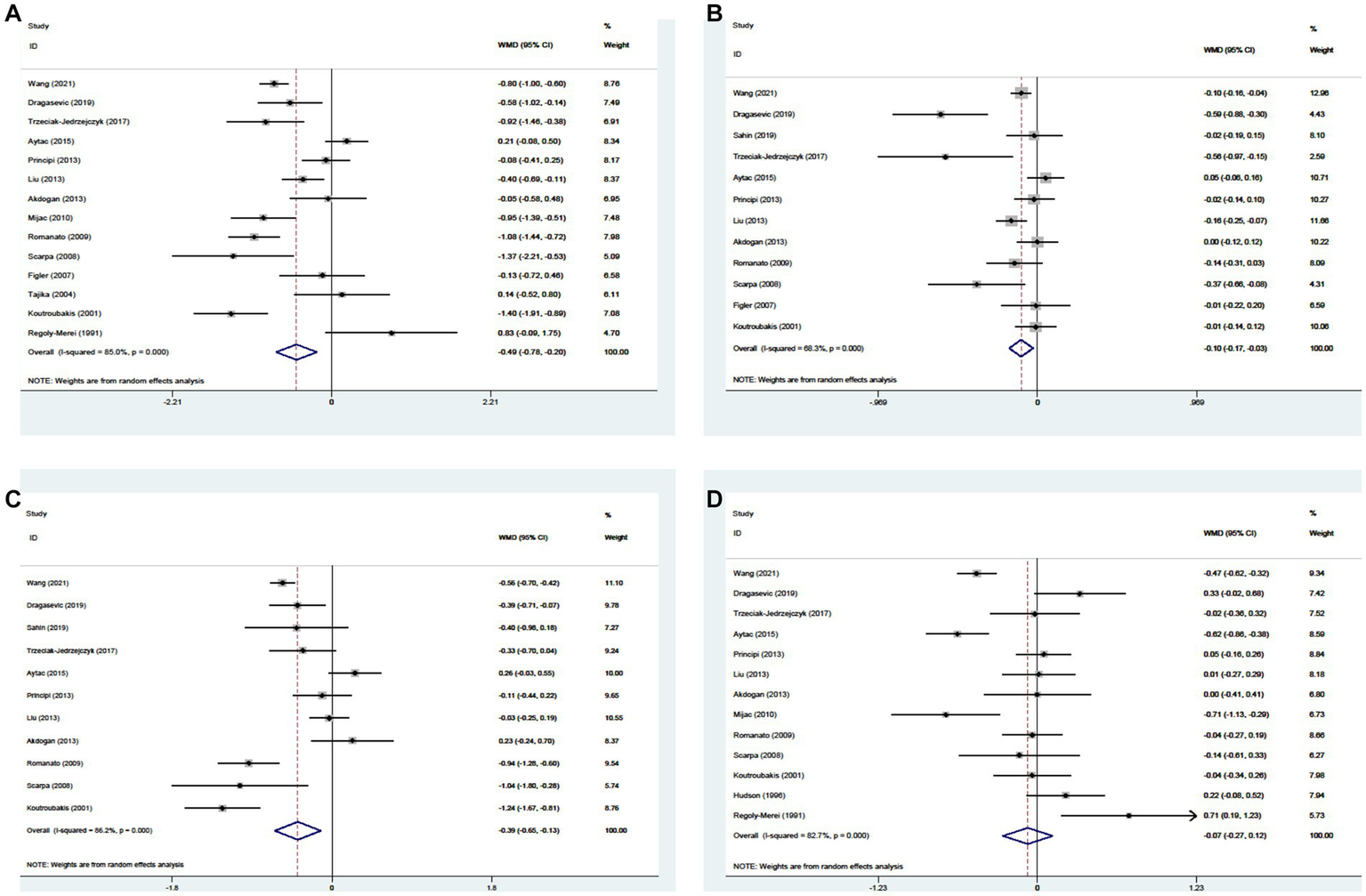 | Üstün et al. (43) | Turkey | Case-control | Full text | 2007.03–2009.10 | IBD vs. HC | 96/65 | 44 ± 13 vs. 41 ± 11 | 4.79 ± 1.26 vs. 4.90 ± 1.00 | NA | 2.72 ± 0.93 vs. 2.84 ± 0.71 | 1.51 ± 0.81 vs. 1.49 ± 0.78 |