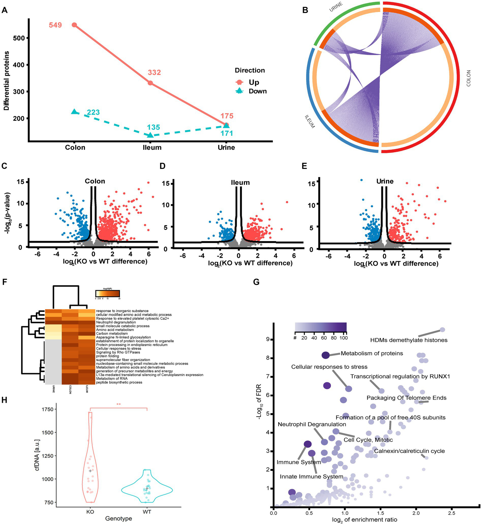 Figure 4. Quantitative proteome analysis of the Abcb1 KO model and comparison of the colon, ileum and urinary proteomes. (A) Summary of the significantly up and down regulated protein within the analyzed proteomes. (B) Overlap of groups in the distinct proteomes. Dark orange color represents the proteins that appear in multiple lists and light orange color represents proteins that are unique to colon, ileum or urine. Purple lines link the protein shared by multiple lists. (C-E) Quantitative comparisons (log-fold-change) based on multiple-hypothesis testing indicating the number of specific proteins that were uniquely regulated within the two tissues colon, ileum and urine significant proteins of the colon, ileum, and urinary samples. (F) Statistically enriched terms (GO/KEGG, canonical pathways, hall mark genes) across the three proteomes. (G) scatterplot of enriched GO Biological process groups with indication of relevant processes. (H) Increase in plasma cell free DNA by NETs associated neutrophil degranulation (p-value = 0.002).