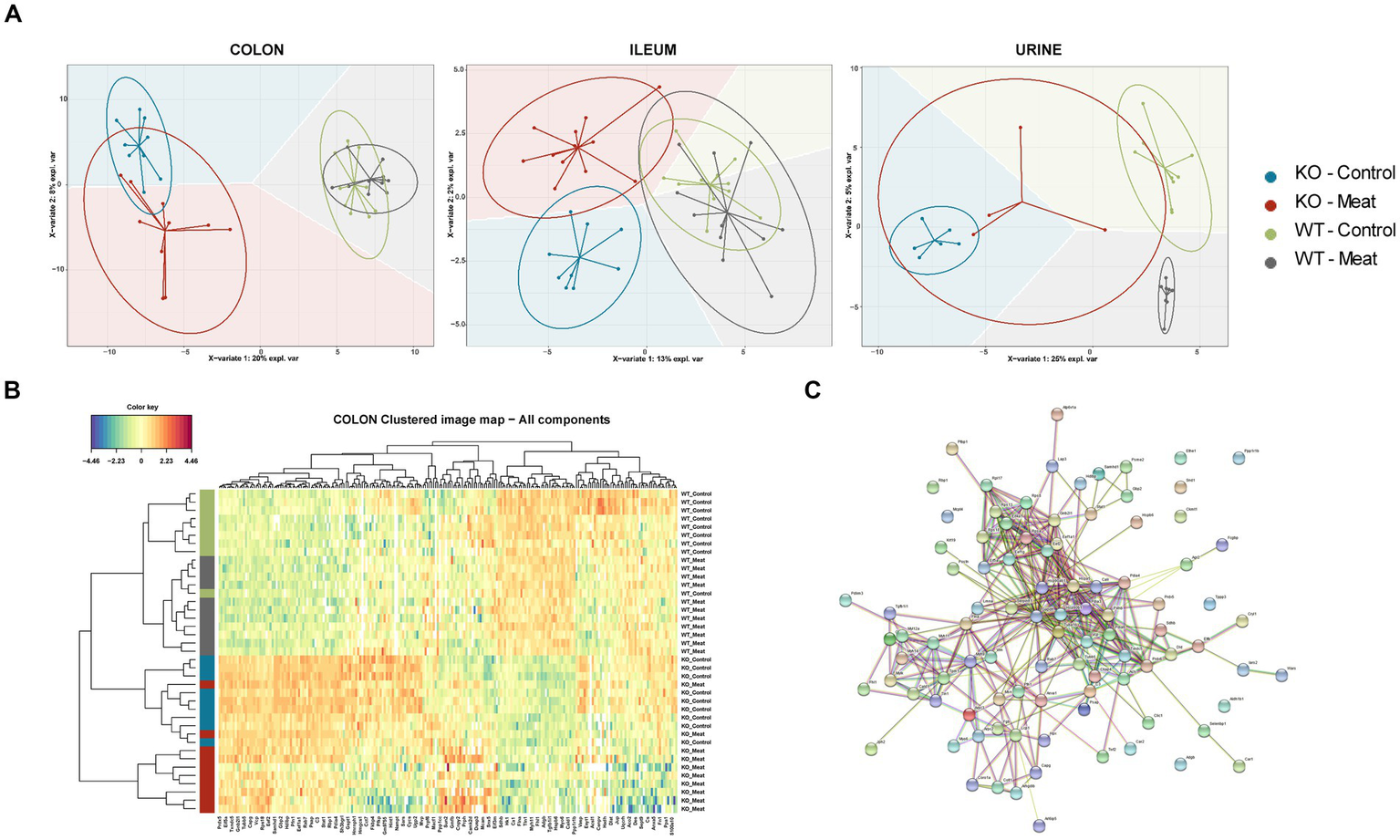 Figure 5. Regional Abcb1 expression in the KO model and comparison of the colon, ileum and urinary samples shows distinct proteome profiles. (A) A supervised model, sparse Partial Least Squares-Discriminant Analysis (sPLS-DA) was used to identify discriminative proteins in the proteomes of the four animal groups. Colored background indicates the computed prediction background for predicting class of samples. (B) Hierarchical clustering of regulated proteins in colon reveals the most important variables for discriminating between the groups, showed a clustering of all four groups. (C) Protein–protein interaction network analysis of discriminative proteins between wildtype and knockout groups by STRING.