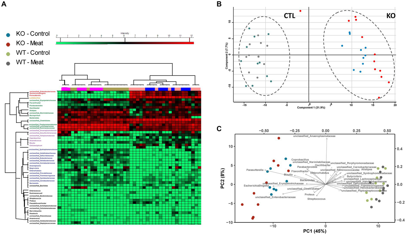 Figure 6. Microbiota community profiling by 16S rRNA gene sequencing. (A) Cluster analysis of the most abundant strains groups using unsupervised cluster analysis; (B) Principal component analysis of strain abundances enabling clustering of WT and KO animals and association of strains to the genotype. (C) Biplot indicating differences in microbiota enabling association of closely related abundance alterations between bacterial strains.