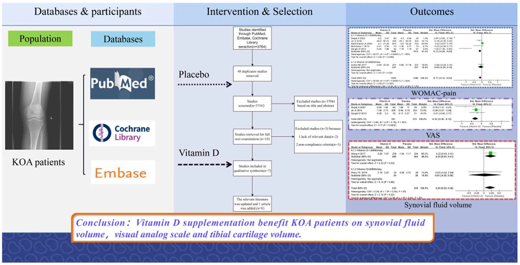 The primary outcomes included the Western Ontario and McMaster Universities Arthritis Index (WOMAC), Visual Analog Scale (VAS), changes in tibial cartilage volume, etc., while the secondary outcomes included general information about the follow-up, the level of 25-hydroxyvitamin D, etc.