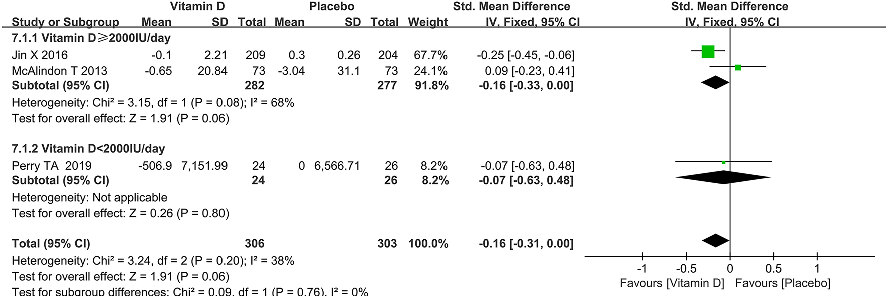 The forest plot for studies on the effect of vitamin D on the tibial cartilage volume.