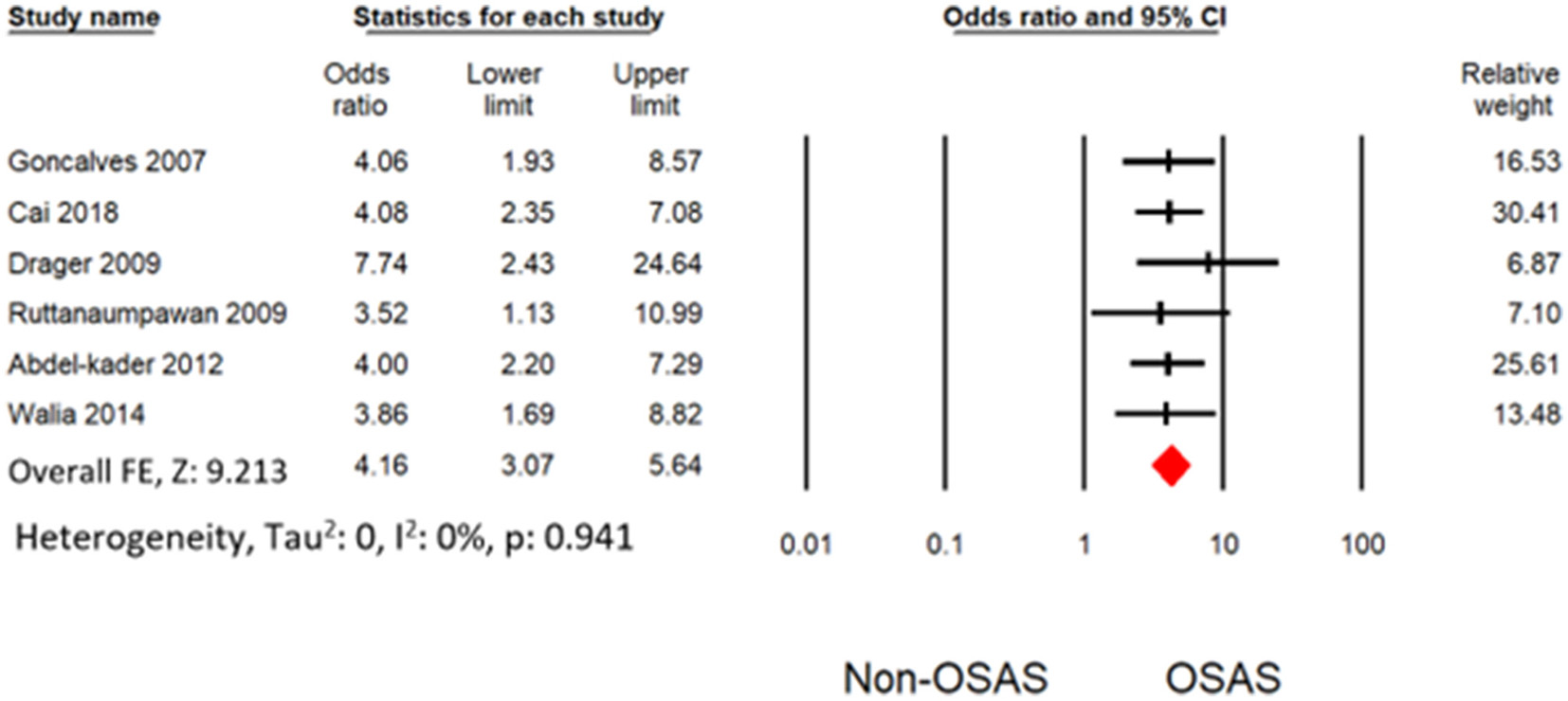 This study comprises seven studies, including 2,541 patients ranged from 20 to 70 years. The pooled analysis of six studies demonstrated that OSAS patients with a history of increased age, gender, obesity, and smoking status are at an increased risk for resistant hypertension (OR: 4.16 [3.07, 5.64], I2:0%) than the non-OSAS patients. Similarly, the pooled effect demonstrated that patients with OSAS were at an increased risk of resistant hypertension (OR: 3.34 [2.44, 4.58]; I2:0%) than the non-OSAS patients when all associated risk factors were adjusted using multivariate analysis.