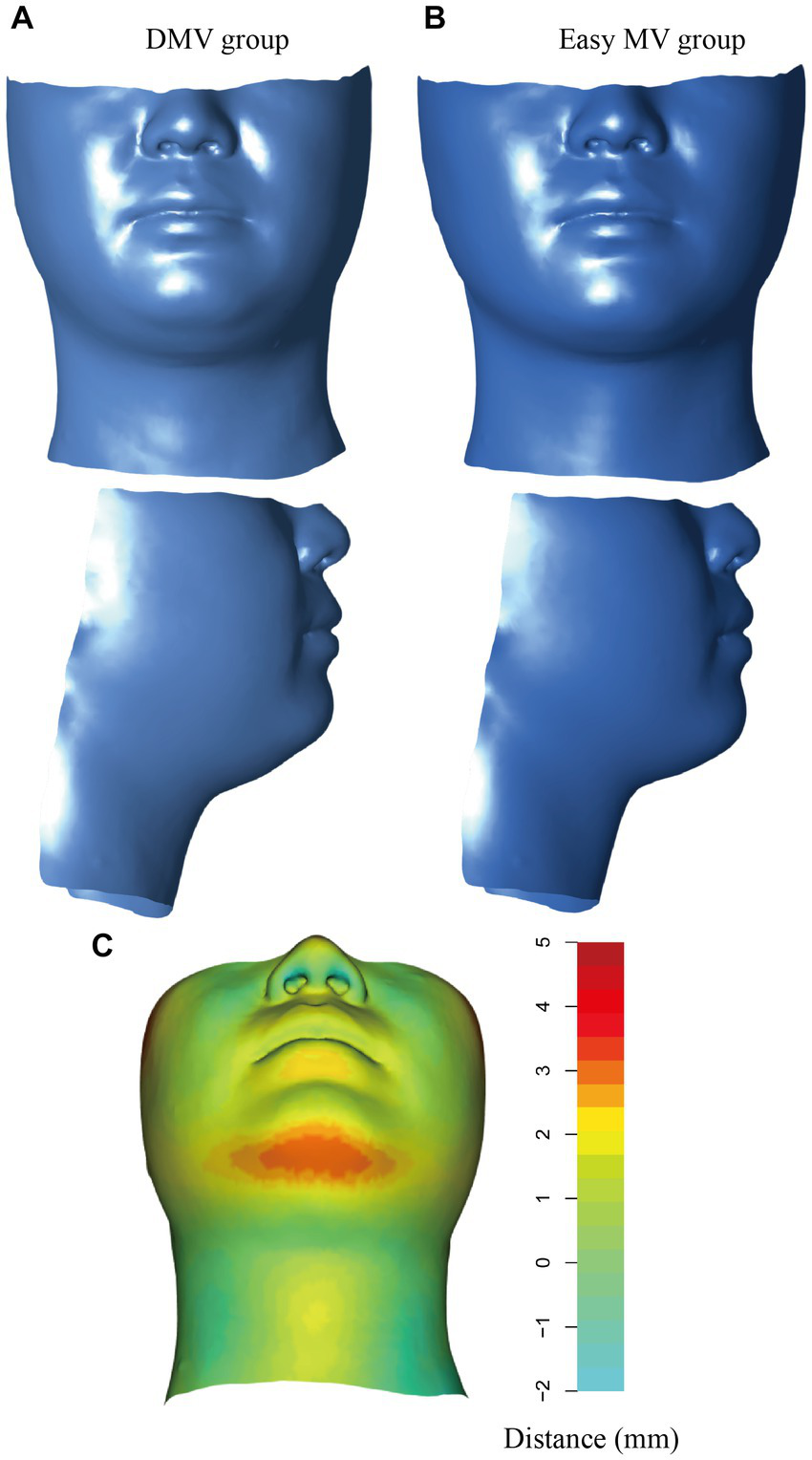 Abnormal facial features can directly impact external mask fit, which potentially makes mask ventilation more challenging, and thus, the patient’s morphology may be a relevant predictor for DMV. Recently, two-dimensional (2D) images and three-dimensional (3D) scans have been employed to characterize the maxillofacial structure and predict diseases (4, 5). In the field of anesthesia, 2D images have been implemented to construct a predictive model for the classification of difficult intubation (6, 7). However, 2D images are susceptible to external factors such as lighting, which may affect their accuracy. Moreover, human faces are inherently 3D objects, and 2D images are merely projections of the face on a flat surface, thus potentially resulting in a loss of important characteristics. To address these limitations, 3D scans are more suitable for examining the complex structures of facial shapes with greater reliability.