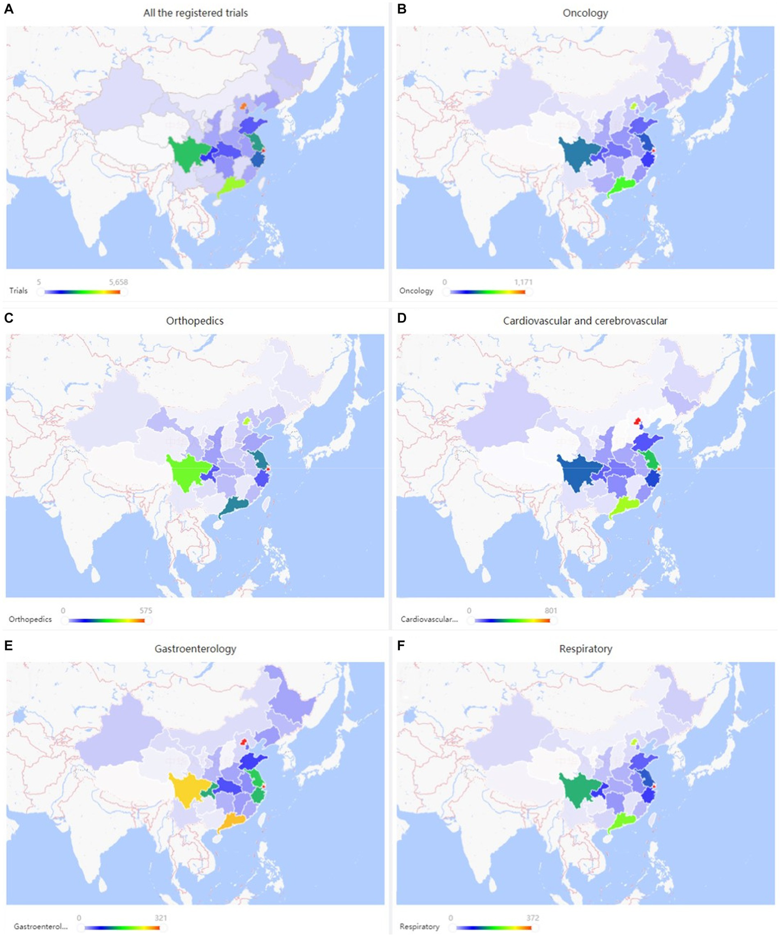 Oncological and cardiovascular diseases receive the highest share of national public funding for medical clinical trial-based research in China. Publicly funded trials represent a major segment of the ChiCTR registry, indicating the dominating role of public governance in this health research sector. Furthermore, the growing number of analyzed records reflect the escalation of clinical research activities in China. The tendency to distribute funding resources toward exceedingly populated areas with the highest incidence of oncological and cardiovascular diseases reveals an aim to reduce the dominating disease burden in the urban conglomerates in China.