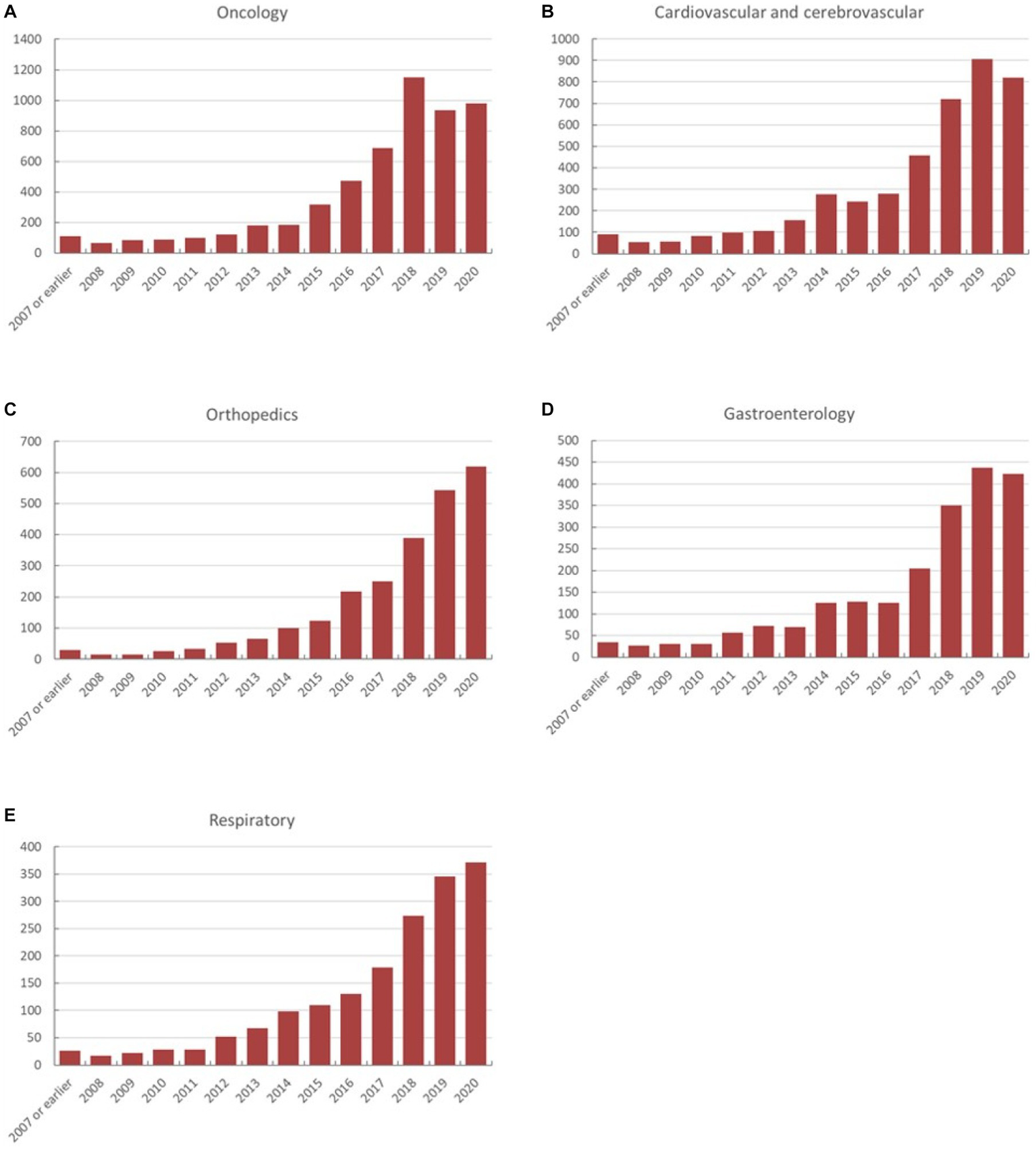 Trials, initiated before the year 2007, were merged into the “2007 or earlier” group. Small-scale trials that targeted <1% of the total sample size (≤320 cases) were merged into “others” (112 screening trials, 149 prevention trials, 222 prognostic trials, and 153 medical service trials) for the convenience of data analysis. Trials that involved the analysis of two or more diseases were classified as “multi-disciplinary trials.” Altogether, 472 trials were not accompanied by the relevant disease or pathology-based description and were classified as the “NA” group.