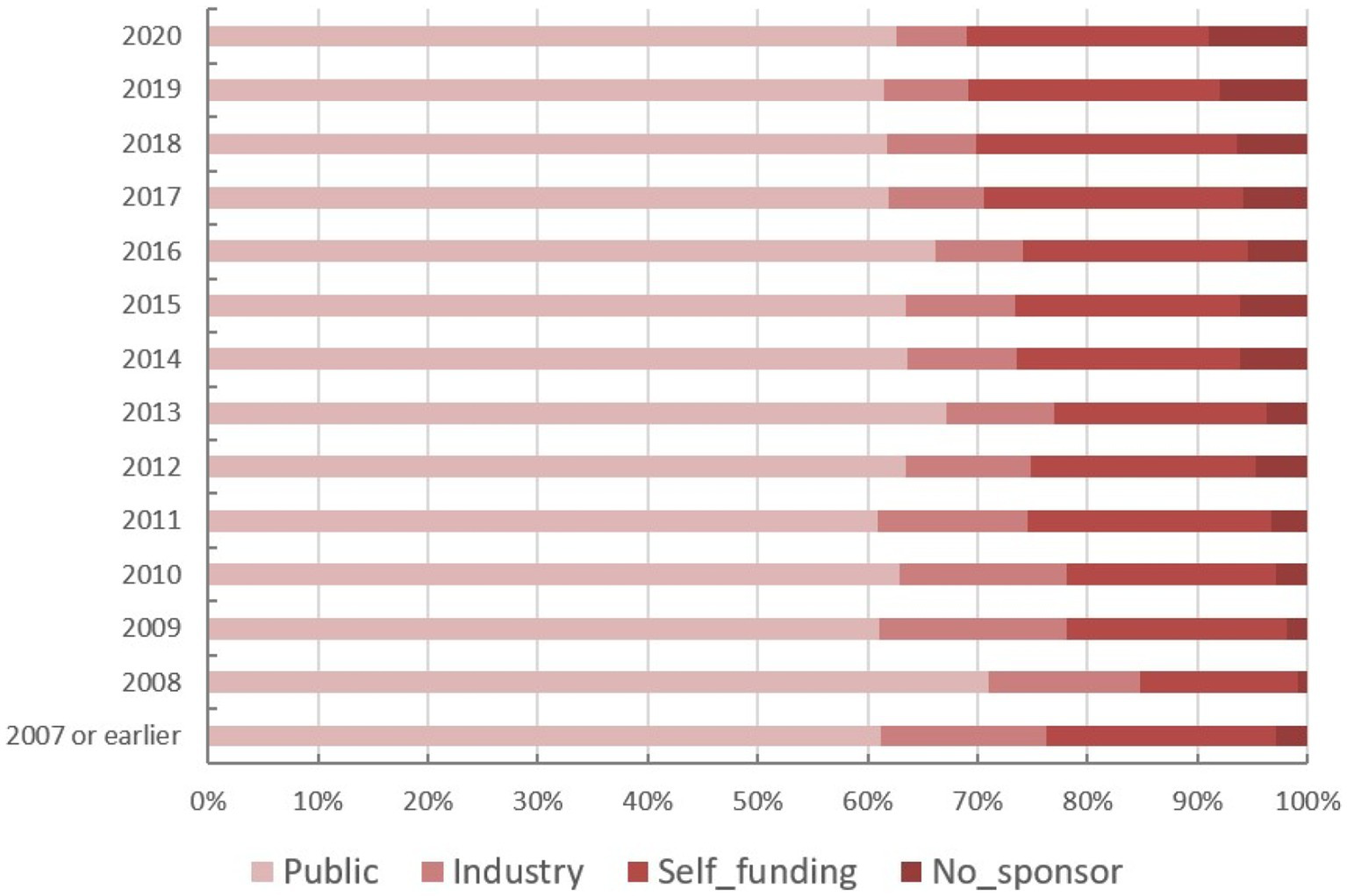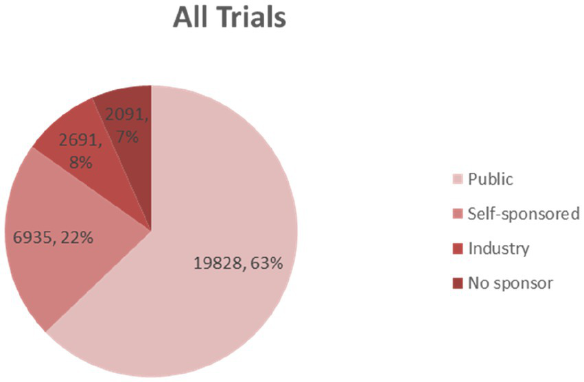 “Public funding” was defined as the acquisition of financial sources from government sources, colleges, universities, non-profit medical organizations, and other scientific institutions worldwide. “Industry funding” indicates the acquisition of resources from corporations, business associations, and any other for-profit organizations. The “self-sponsored” category indicates that the funding resources were from the experimenter himself or belonging to a group. The “No funding” category includes trials that were executed without any identified form of funding.