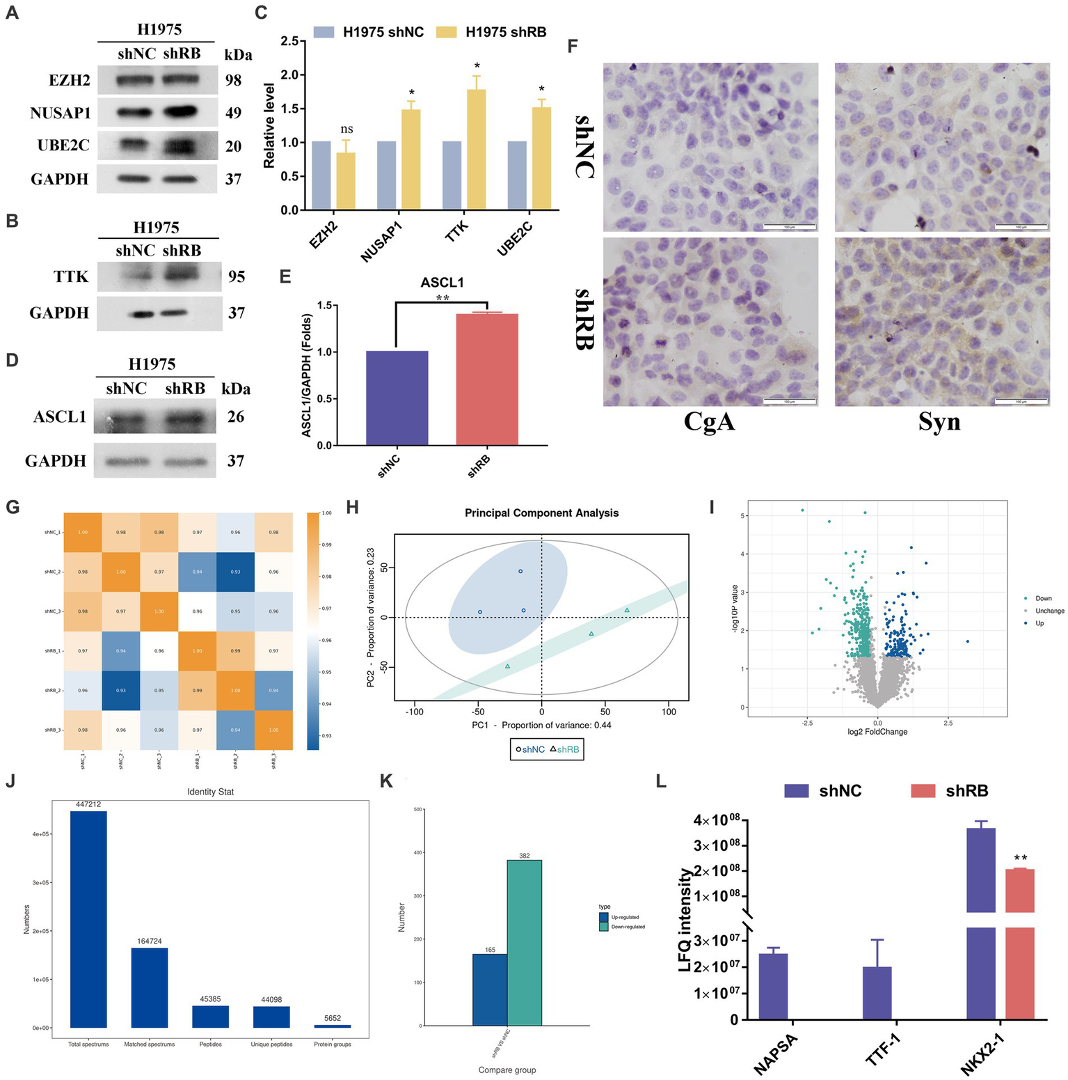 The RB1-knockdown H1975 experimental group cells (n = 3) and control cells (n = 3) were subjected to Label-free analysis in Shanghai Genechem Co., Ltd.. Protein was extracted, and 20 μg of protein was taken from each sample for SDS-PAGE electrophoresis (constant voltage 250 V, 40 min). Subsequently, DTT was added to each sample to a final concentration of 100 mM, followed by incubation in a boiling water bath for 5 min, and cooled to room temperature. Next, 200 μL of UA buffer was added to each sample and mixed well. The mixture was then transferred to a 30kD ultrafiltration centrifuge tube for centrifugation, and the filtrate was removed. After that, 100 μL of IAA buffer solution was added, and the samples were shaken for 1 min, followed by incubation at room temperature for 30 min in the dark, and then centrifuged. Next, 100 μL of UA buffer was added, and centrifugation was performed. Then, 100 μL of 50 mM NH4HCO3 solution was added, followed by centrifugation. The collection tube was replaced, and 40 μL of trypsin buffer (4 μg trypsin in 40 μL 50 mM NH4HCO3 solution) was added. The samples were shaken for 1 min and placed at 37°C for 16–18 h. After that, the samples were centrifuged, and 40 μL of 50 mM NH4HCO3 solution was added again, followed by centrifugation, and the filtrate was collected. Finally, the peptides were desalted, lyophilized, and then reconstituted by adding 40 μL of 0.1% formic acid solution. In the Easy nLC system, 0.1% formic acid aqueous solution (solution A) and 0.1% formic acid acetonitrile aqueous solution (solution B) were used as flow phases, and the separation of peptides was performed in the chromatographic column.