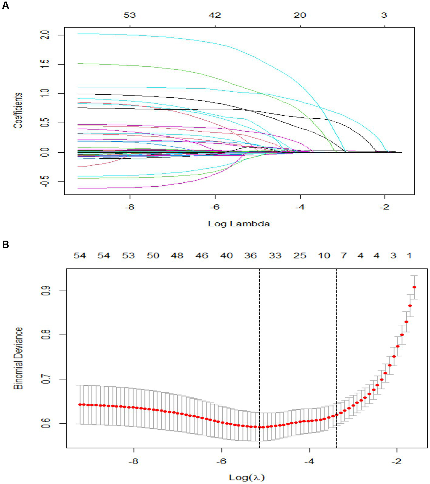The continuous variables in this study were nonnormal distributions; we used the median of the interquartile range (IQR) to express them. The Mann–Whitney test was used for comparison. Categorical variables were expressed as percentages and numbers and were compared using the chi-square test. Patients with GIB were randomly divided into a training group of 1,010 patients and a validation group of 432 patients in the ratio of 7:3. LASSO regression analysis was used for variable shrinking, and variables with regression coefficients equal to zero were eliminated during the contraction process. Then the R language was used to run 10 K cross-validations and to select the best lambda value to obtain the required variables. According to “lambda 1se,” the following variables were obtained: HR, aPTT, SOFA, acute physiology score (APSIII), cerebrovascular disease, AKI, norepinephrine, vasopressin, and dopamine. This was followed by multivariate logistic regression analysis to establish a predictive model and develop a nomogram. STATA (version 17.0) software was used to process the raw data and R Studio (version 4.2.1) for the LASSO regression, logistic regression, and model visualization. p < 0.05 was considered statically significant.