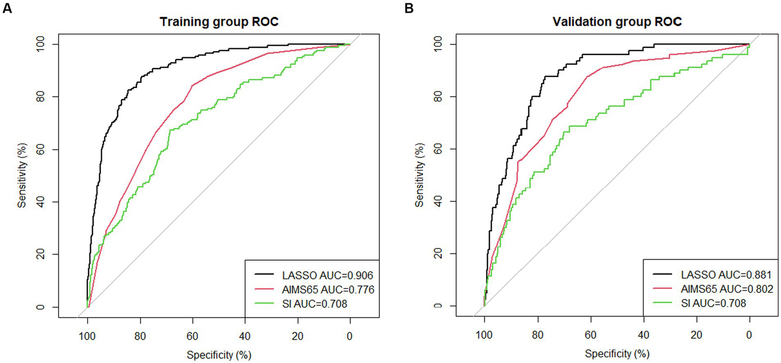 Gastrointestinal bleeding (GIB) is a common acute and critical disease in clinical practice (1, 2). GIB refers to any bleeding that occurs within the gastrointestinal (GI) tract, which includes the esophagus, stomach, intestine, rectum, and anus. GIB can be divided into upper gastrointestinal bleeding (UGIB) and lower gastrointestinal bleeding (LGIB) according to different bleeding sites. UGIB sites come from the esophagus, stomach, duodenum and near the Treitz ligament; peptic ulcer, esophageal varices and erosive esophagitis are the common causes (3); LGIB is defined as bleeding at the distal end of the Treitz ligament, diverticular bleeding, colitis, and colon polyps are common causes (4, 5); it is often accompanied by hemorrhagic shock, hemodynamic instability, abnormal blood coagulation, organ failure, and even death. Although its incidence has decreased over recent years, the mortality rate is still high. The 30-day mortality rate among patients with upper GIB is 11% (6); it is about 5% among patients with lower GIB (7). In the past, various scores for upper and lower GIB (such as the Glasgow-Blatchford, Rockall, AIMS65, ABC, Oakland, Strategy, NOBLADS, and BLEED score) have been used to assess prognosis (8, 9). These are non-ICU specialty scoring systems commonly used to predict rebleeding, gauge a transfusion rate, or determine ICU admission, and the accuracy of mortality prediction is insufficient [area under the receiver operating characteristic curve (AUROC) <0.8] (10–15).