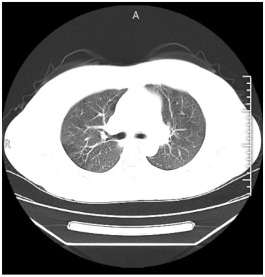 Superficial ultrasonography of the forearm revealed an irregular mass measuring approximately 56.7 mm × 16.4 mm with unclear borders (Figure 1). CT examination of the chest showed no abnormality (Figure 2). The laboratory blood test revealed a hemoglobin level of 131 g/L, leukocytes of 5.13 × 109/L, neutrophil percentage of 70.6%, lymphocyte percentage of 19.4%, eosinophil percentage of 4.68%, and hematocrit of 20 mm/h. Liver and renal function tests were normal.