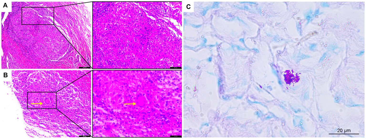 Histological analysis of soft tissue tuberculosis. (A) H&E staining showing granulomas with inflammatory cell infiltration and (B) multinucleated giant cells (×200); (C) Acid-fast bacillus staining was positive. Yellow arrows indicate multinucleated giant cells (×400).