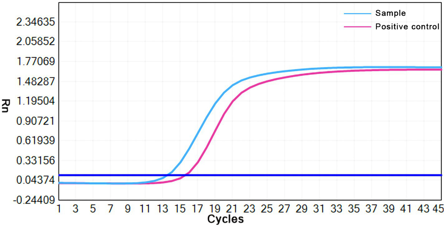 The lipoma diagnosis was established according to the examination results, and the mass was resected on August 12, 2022. The mass was observed intraoperatively as a cystic-solid mass with an incomplete covering, and the mass incision revealed grayish-white fluid with small grayish-white particles like fish eggs. Soft tissue tuberculosis of the right forearm was identified by postoperative pathology, which showed fibrocystic tissue with granulation tissue and granuloma formation, inflammatory cell infiltration (Figure 3A), and multinucleated giant cells in some areas (Figure 3B). Staining for acid fast bacilli were positive (Figure 3C) and the IS6110 gene was detected by quantitative real-time PCR (qPCR) using the Mycobacterium tuberculosis Complex kit (Cat.801176, Zeesan Biotech, Xiamen, China), the result showed positive amplification (Figure 4). However, there is no standardized treatment for soft tissue tuberculosis. Considering that the patient lives in a region with a high prevalence of isoniazid resistance (6). The Chinese guideline for diagnosis and treatment of pulmonary tuberculosis suggests that the 2HRZE/4HRE regimen be used in regions where new tuberculosis patients have high prevalence of resistance to isoniazid (7). Finally, we formulated a 2HRZE/4HRE anti-tuberculosis regimen for the patient. It included a 4-drug anti-tuberculosis treatment with isoniazid (H) 300 mg, rifampicin (R) 450 mg, ethambutol (E) 750 mg, and pyrazinamide (Z) 1,500 mg for 2 months, followed by isoniazid (H) 300 mg, rifampicin (R) 450 mg, and ethambutol (E) 750 mg for 4 months. Ten days after the surgery, the patient had good wound healing in the right forearm. After 6 months of anti-tuberculosis treatment follow-up, the patient’s swelling had completely disappeared and the appearance of the right hand was similar to that of the left hand.
