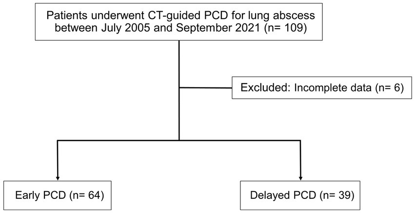 Lung abscess was once a life-threatening disease, with a mortality rate of up to 75% (1). The outcomes of lung abscesses have improved over past decades due to timely diagnosis, effective antimicrobial therapy, application of drainage, or surgery. Currently, about 80%–90% of pyogenic lung abscesses are treated successfully with antibiotics. However, 10%–20% of patients with lung abscesses need invasive treatment, such as surgical intervention or percutaneous transthoracic catheter drainage (PCD), due to conservative treatment failure. In the past, PCD for lung abscesses was usually reserved for patients who fail to improve after antibiotic treatment (2–7). Because of the concerns about major complications, such as bronchopleural fistula (BPF), pneumothorax, hemoptysis, and empyema (8). With technological improvement, image-guided PCD is considered less invasive and safer than surgical intervention (9, 10). It can also bridge the gap between medical and operative management (11). The role of early PCD remains unclear. Current evidence, comprising a single or a few case series, show a high success rate without major complication or mortality in early PCD with concurrent antibiotics (12–14). Given the paucity of data in this field, we aim to compare the safety and efficacy of early versus delayed drainage in patients with lung abscesses. We hypothesize that early PCD results in better outcomes compared with delayed PCD.