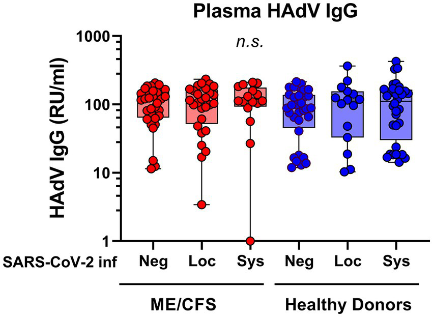 Plasma antibody reactivity to human adenoviruses in patients with ME/CFS (n = 75, red dots/boxes) and healthy donors (n = 79, blue dots/boxes). Sys: participants SARS-CoV-2 RBD (RBD)-positive for systemic response in plasma (with or without saliva IgG; ME, n = 15; HD, n = 32). Loc, participants RBD-positive for local response in saliva (ME, n = 28; HD, n = 15). Neg, participants RBD IgG-negative both in plasma and saliva (ME, n = 32; HD, n = 32). Data are presented as boxplots with median values with minimum to maximum whiskers. Statistically significant differences were not found (n.s., non-significant) according to non-parametric Kruskal-Wallis procedure and false discovery rate adjustment (5%) according to Benjamini, Krieger and Yekutieli procedure (14). RU/ml, relative units per milliliter.