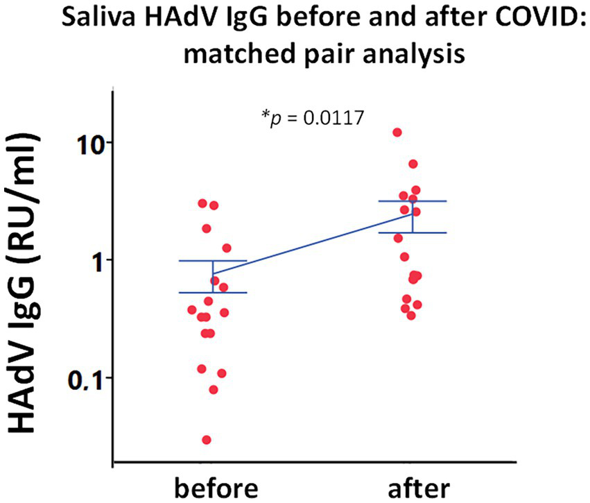 Paired analysis of saliva HAdV IgG from the same subjects before and after SARS-CoV-2 infection (n = 18). Individual points represent saliva HAdV IgG concentration as relative units per ml (RU/ml) in a longitudinal analysis of 18 individuals. Blue lines represent mean ± SEM. Statistically significant difference was tested in using matched pairs analysis platform (JMP statistical program). *p < 0.05 indicates statistically significant differences.