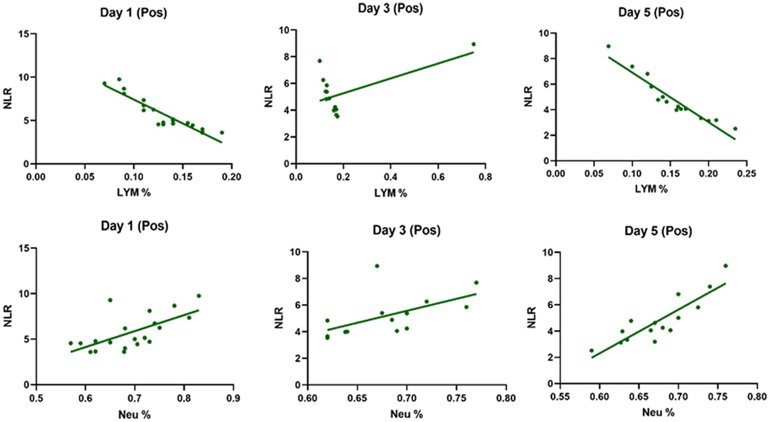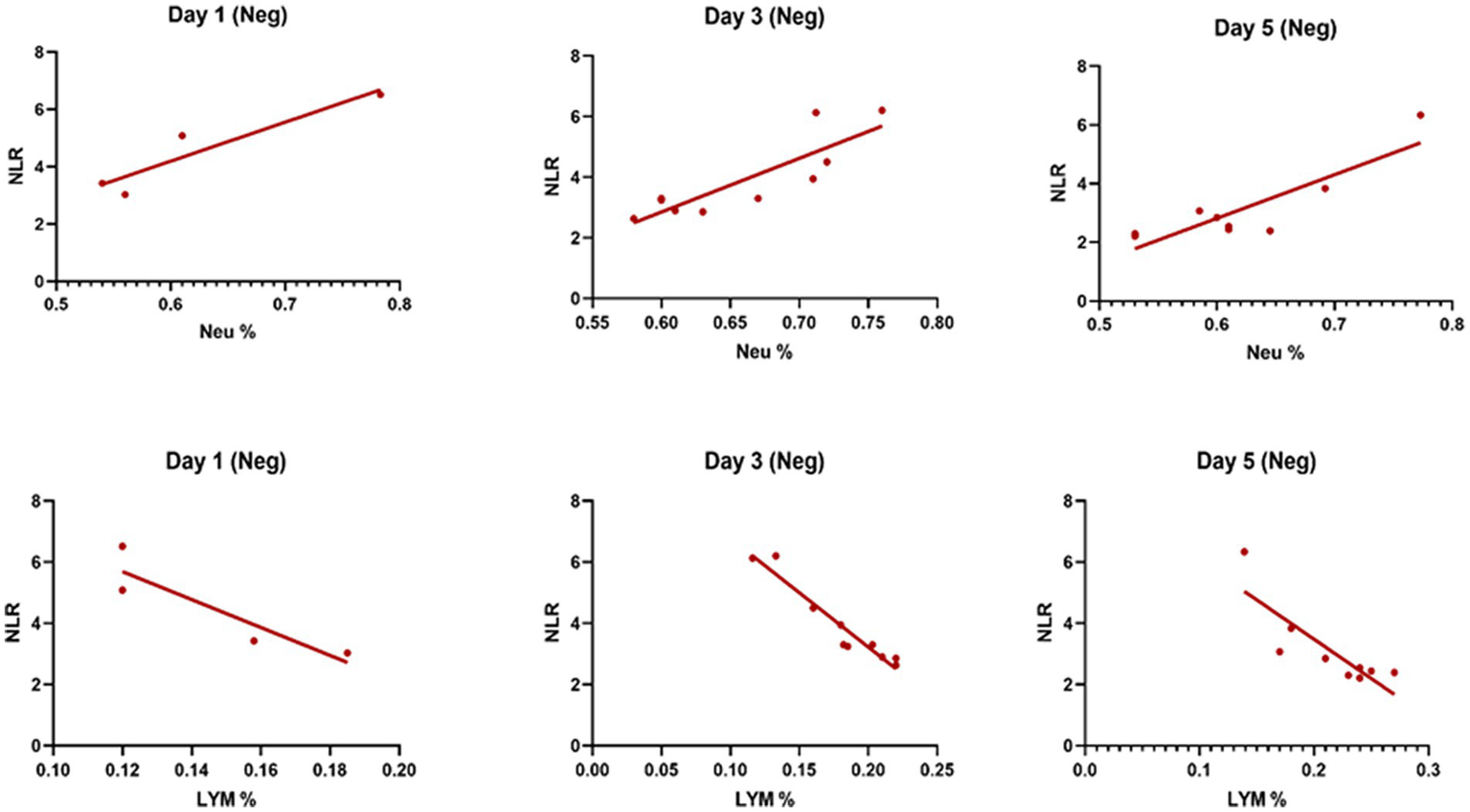 The linear regression analysis of NLR-Neu% and NLR-LYM% of patients in the negative type in 5 days. Within the five-day period after admission Neu-weighted NLR shows an increase, while Lym-weighted NLR exhibits a fall, suggesting a shift from neutrophil-dominant to neutrophil-balanced illness, which was statistically significant (p < 0.05).