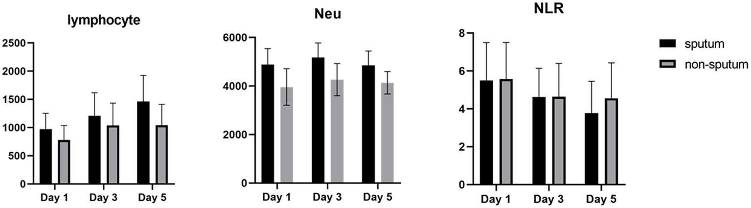 The results of the present study showed that the levels of WBC, LYM, and NEU as well as erythrocyte sedimentation rate (ESR) increased significantly on the 5th day compared to the first day in both groups with sputum. However, the levels of C-reactive protein (CRP), Neutrophil-to-Lymphocyte Ratio (NLR) and lactate dehydrogenase (LDH) did not show significant changes.