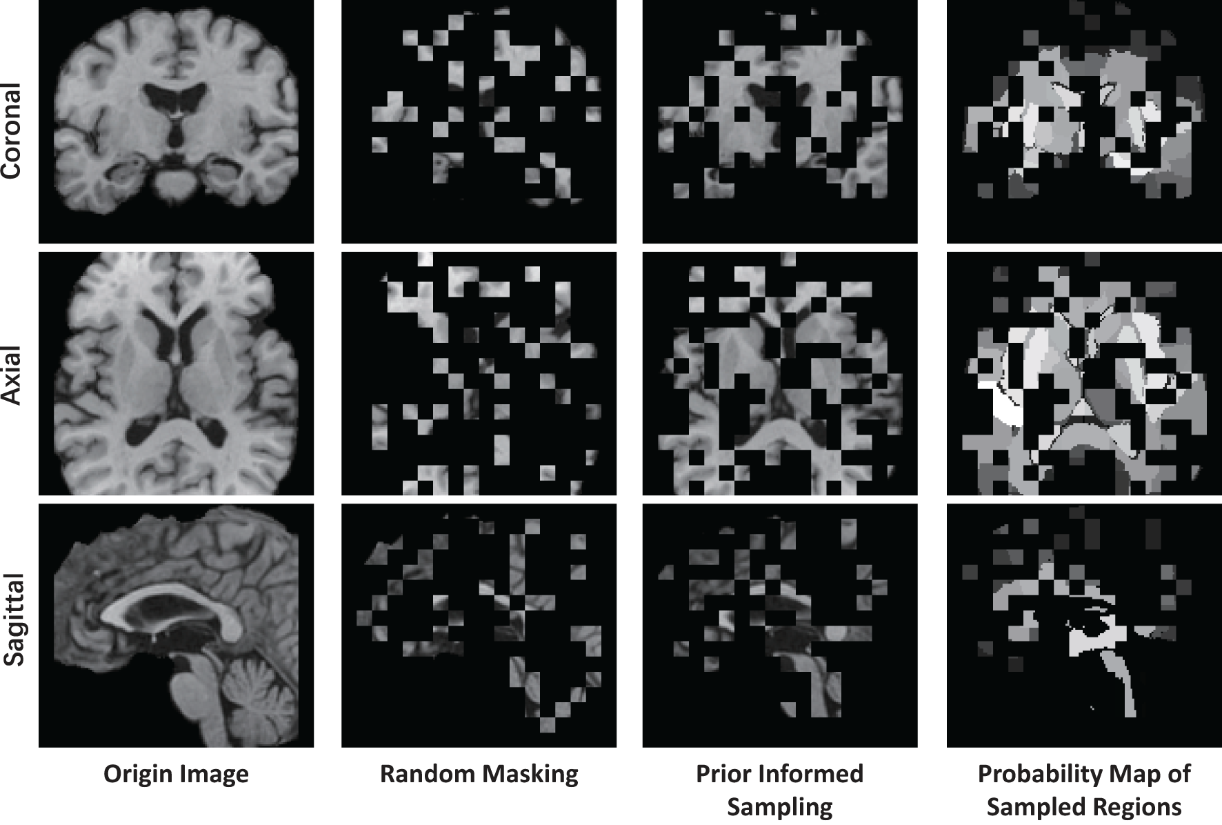 Example of visualizing a T1 MR image using different masking strategies with a masking ratio of 0.75. This image is center-cropped with a shape of 128 × 128 × 128, and each token has a patch size of 8 × 8 × 8.