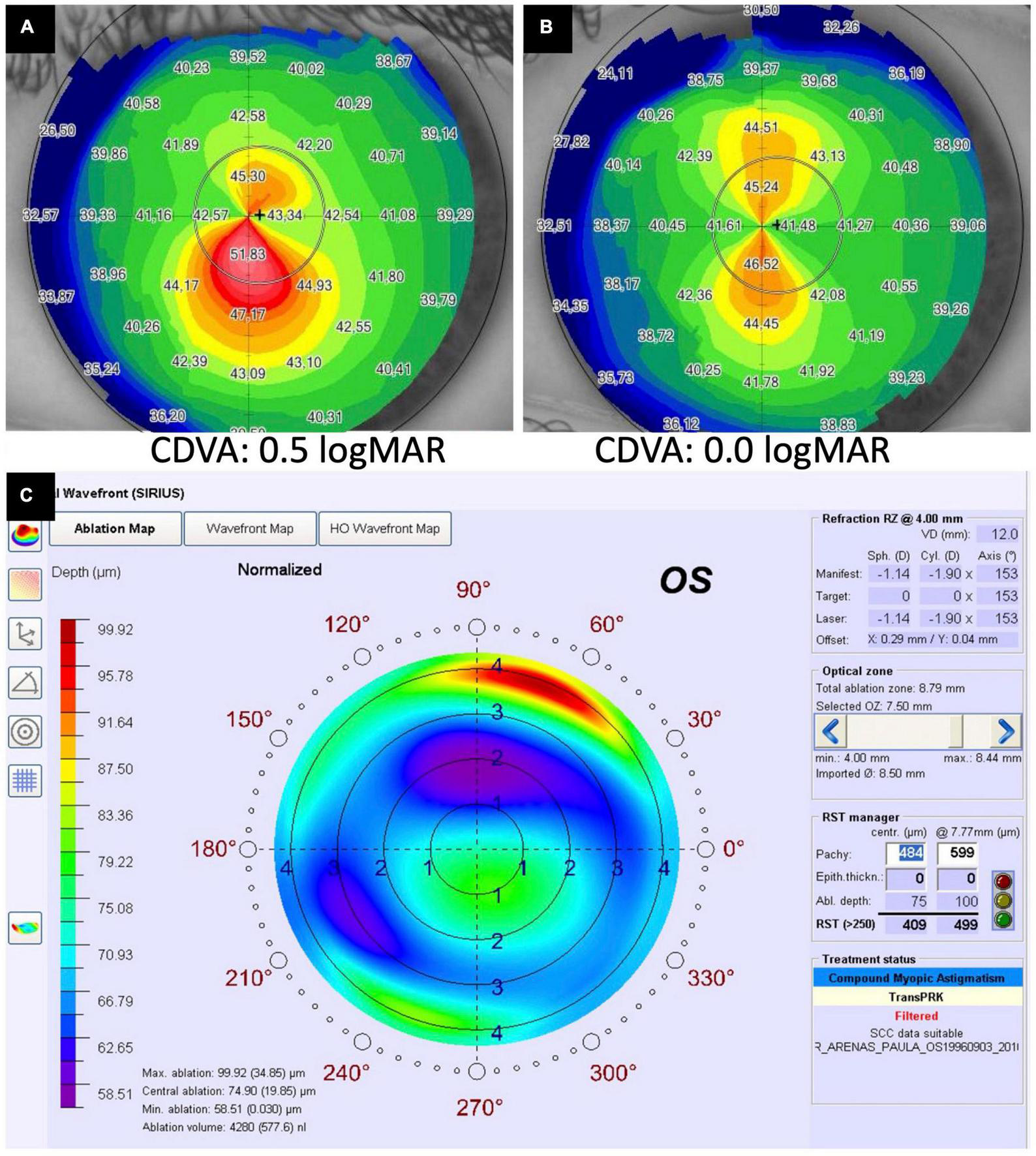 | A (ARC; 3 mm zone) | B (PRC; 3 mm zone) | C (thinnest pachymeter) | D (BDVA) | Scarring | |