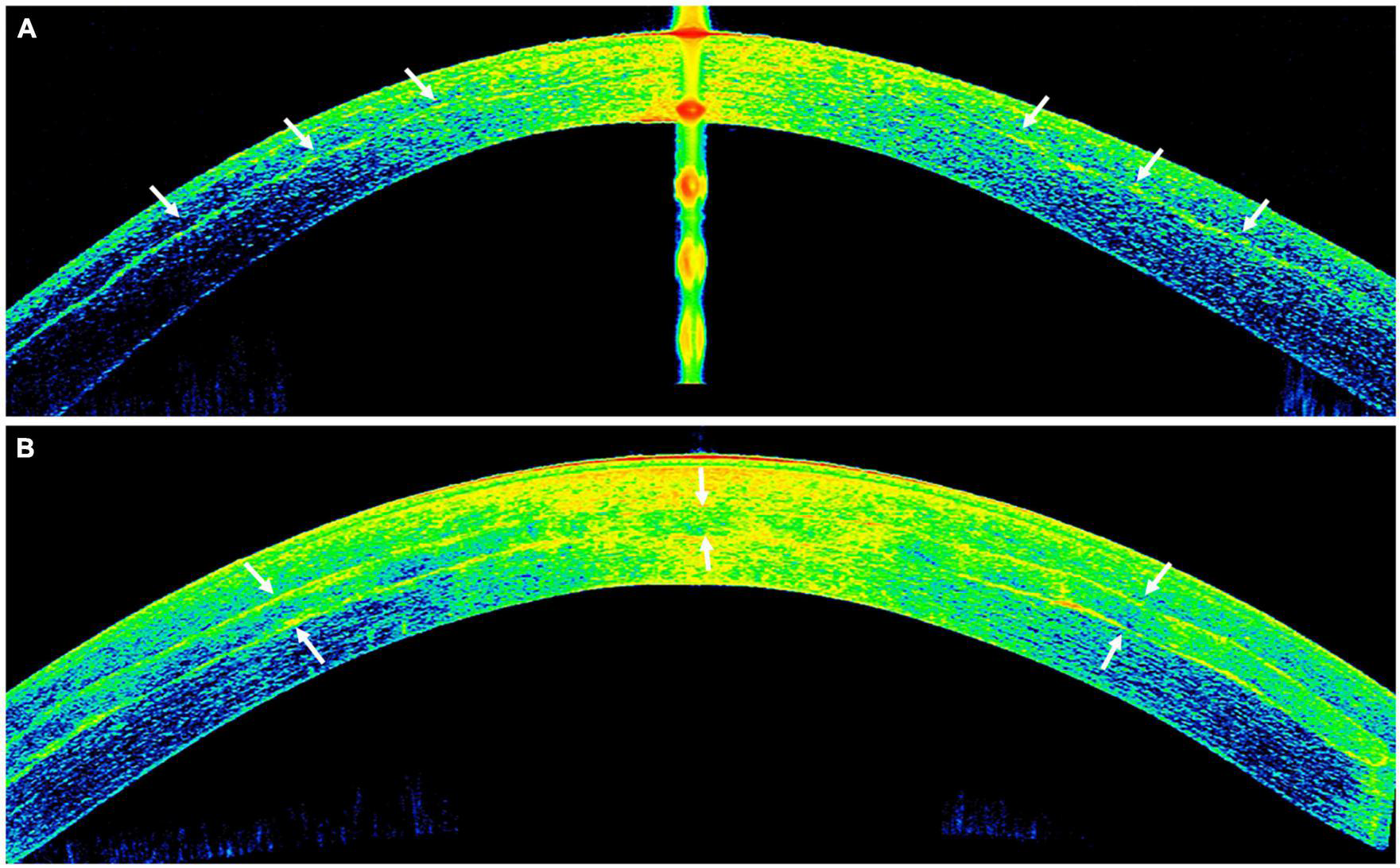 A meta-analysis of 11 studies evaluating the efficacy and safety between A-CXL and C-CXL demonstrated similar postoperative outcomes, in terms of mean keratometry (Kmean), uncorrected-distance-visual-acuity (UDVA), and corrected-distance-visual-acuity (CDVA) (105). However, A-CXL was shown to achieve less reduction in maximum keratometry (Kmax) but with less impact on corneal thickness and endothelial cell density when compared to C-CXL. The observed difference in the effect (in Kmax) may be attributed to less energy penetration into the cornea hence less corneal biomechanical stiffening in the A-CXL group, evidenced by shallower corneal demarcation line in A-CXL when compared to C-CXL (69, 84). Touboul et al. (106) reported a corneal demarcation line at a depth of 100–150 μm using a 30 mW/cm2 irradiance protocol for 3 min. This is possibly due to the shorter riboflavin soaking time of 10 min in their study. Studies with riboflavin soakage for 15 min have reported the demarcation line to be deeper than 200 μm (26, 107). Kymionis et al. (108) found a demarcation line at a mean of 288–290 μm, using a protocol of 9 mW/cm2 for 10 min. A study comparing the depth of demarcation lines in two groups of patients undergoing A-CXL with 18 mW/cm2 for 5 min and different riboflavin soakage times (20 and 30 min) found that it was deeper in the group with longer soakage time before UV-A irradiation (109).