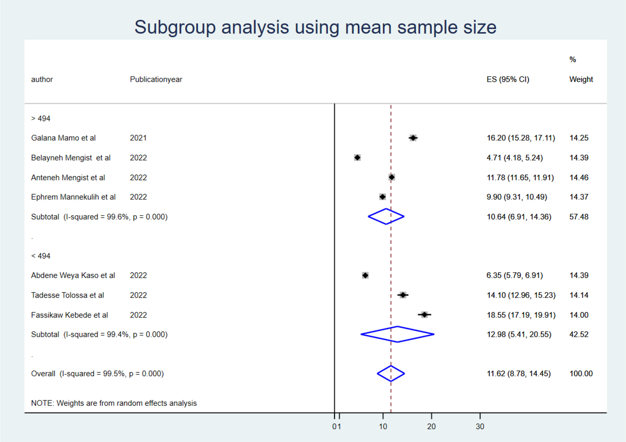 To identify the source of heterogeneity, the subgroup analysis was conducted using region, mean sample size, and mean follow-up period. Hence, the subgroup analysis for sample size was computed using a mean sample size of 494, and heterogeneity was not explained by the sample size (<494) I2 = 94.8 with a p-value of 0.000, and those conducted using a sample size greater than the mean (>494 (I2: 95.7 with a p-value of 0.00) (Figure 2). The mean follow-up period was 7 days, and heterogeneity was not explained by the follow-up period (7 days) I2 = 96.2 with a p-value of 0.000, and studies conducted greater than the mean follow-up days (>7 days) I2 = 97.6% with a p-value of 0.000 (Figure 3). A subgroup analysis by region was performed, but heterogeneity was not explained by it in the Amhara region (I2 = 99.0% with a p-value of 0.000) or the Oromia region (I2 = 89.5% with a p-value of 0.000) (Figure 4). Finally, the sources of heterogeneity were not identified through the subgroup meta-analyses.