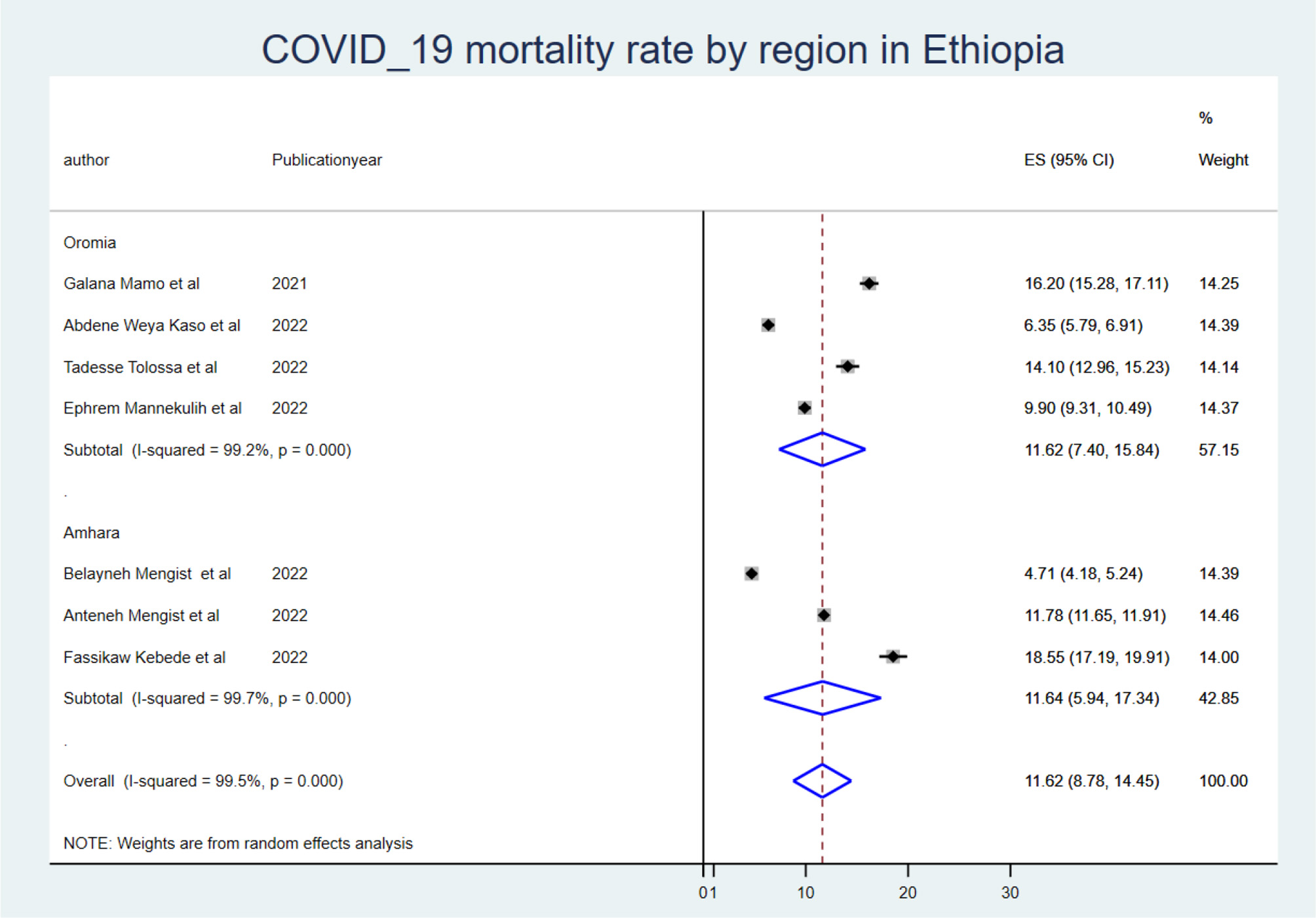 The mortality rate of COVID-19 inpatients was 9.13 (95% CI: 5.38, 12.88) per 1,000 person-days of COVID-19 mortality-free observations. When we looked at it by region, the Oromia region had the highest COVID-19 mortality rate (ES: 11.48 (95% CI: 7.31, 15.64), and the Amhara region had the lowest (ES: 6.12 (95% CI: −0.89, 13.14).