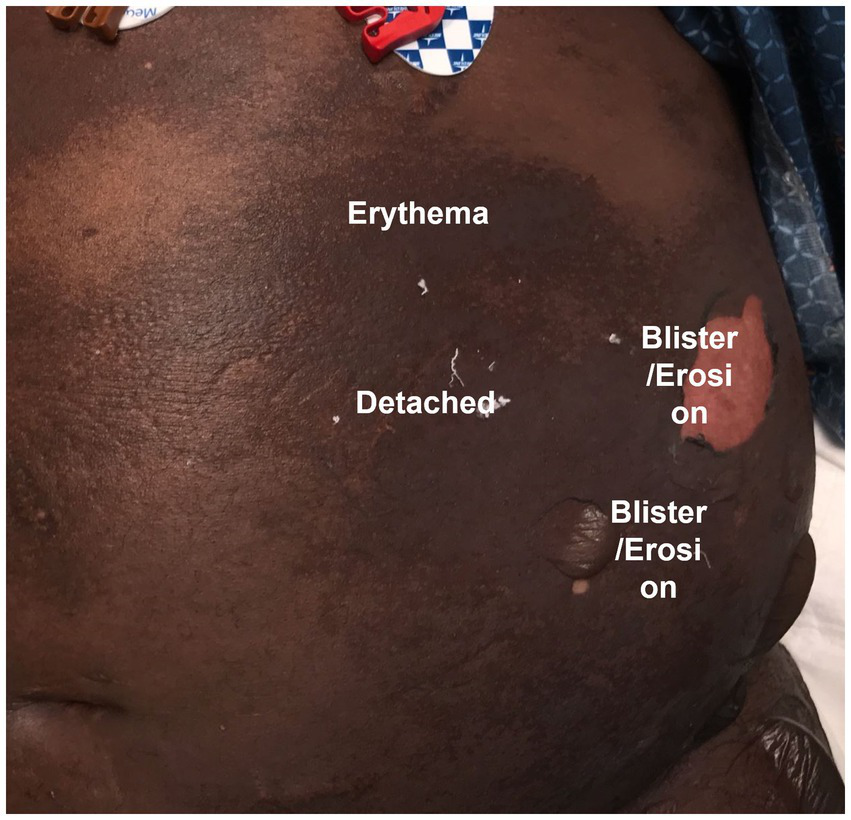 Example photograph of Vanderbilt Drug Safety patient (with permission) to guide standardized SJS/TEN scoring by illustrating the categorization of different appearances of skin into different terminology. Photo by Madeline Marks and Austin Cronin, VDTRC.org.