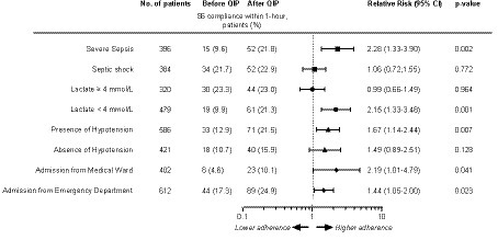 Figure 2. Forrest Plot of adherence to sepsis six bundle within 1-h stratified by baseline characteristics in the after vs. before QIP period. Dashed line describes the RR = 1. Missing data are as follows: 1. Severe sepsis and septic shock: Before QIP, n = 153; After QIP, n = 190; 2. Lactate levels: Before QIP, n = 146; After QIP, n = 178; Presence or absence of hypotension: Before QIP, n = 42; After QIP, n = 74; Location of admission: Before QIP, n = 38; After QIP, n = 71.