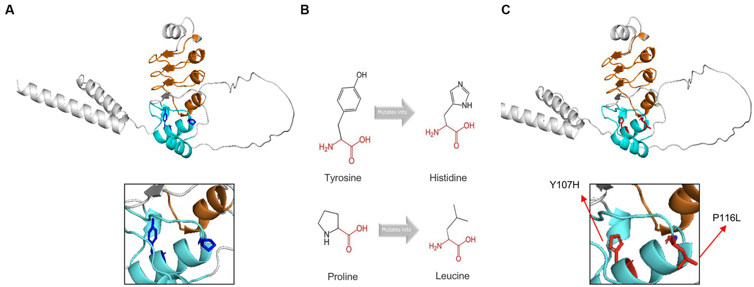 Tertiary structure prediction of mutant proteins. The main structure of the CFAP410 protein was colored in gray. Leucine-rich repeats was in orange and LRRCT was in blue. (A) The side chains of the wild-type were colored in blue. (B) The schematic structures of the original and the mutant amino acids. The backbone was colored in red; The side chain was colored in black. (C) The side chains of the wild-type were colored in red.