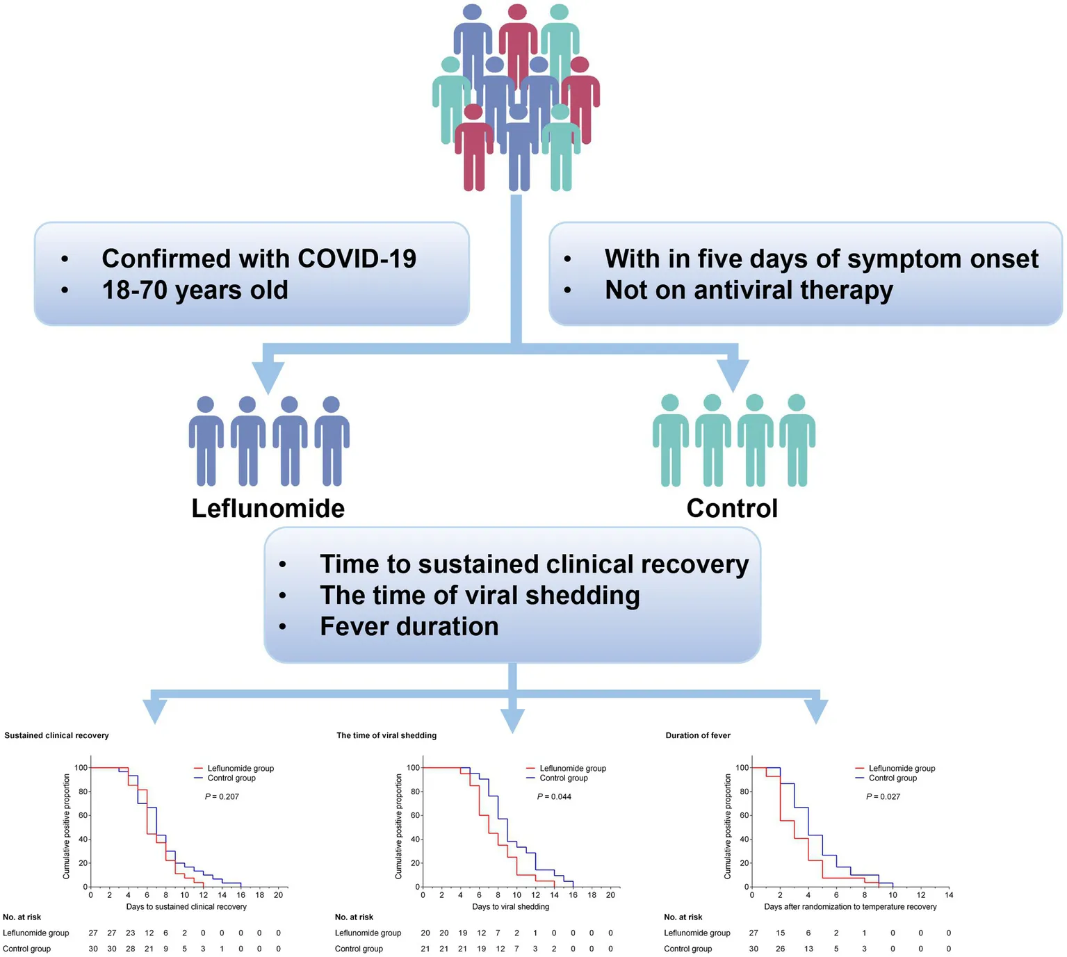 In summary, our data show that leflunomide administration early in the course of acute COVID-19 Omicron variant infection can effectively reduce fever symptoms and shorten viral shedding time. However, further well-designed, multi-center, and large-sample studies are now required to confirm efficacy.
