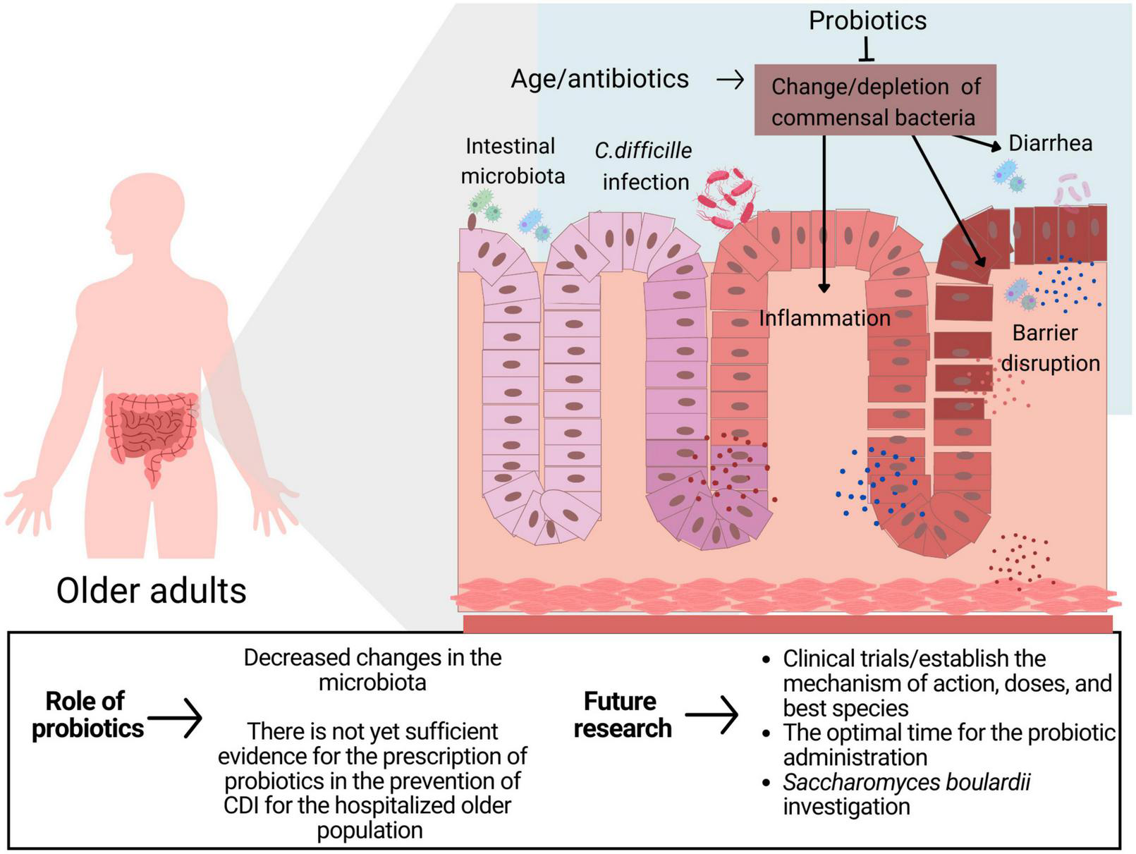 There is not yet sufficient evidence for the prescription of probiotics in the prevention of CDI for the hospitalized older population taking antibiotics. Robust clinical studies that include the S. boulardii strain are needed to address the scientific and clinical gaps on the potential protective effect of probiotics on CDI.