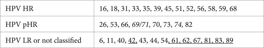 HR means high-risk, LR means low-risk, and p, probable. The underlined genotypes were detected only in the EXTRA II version, while those in italic were no longer detected. When HPV 52 and a weak signal for HPV 31 were detected, only 52 was recorded seeing as non-specific activity was attributed to HPV 31, as indicated by the manufacturer.