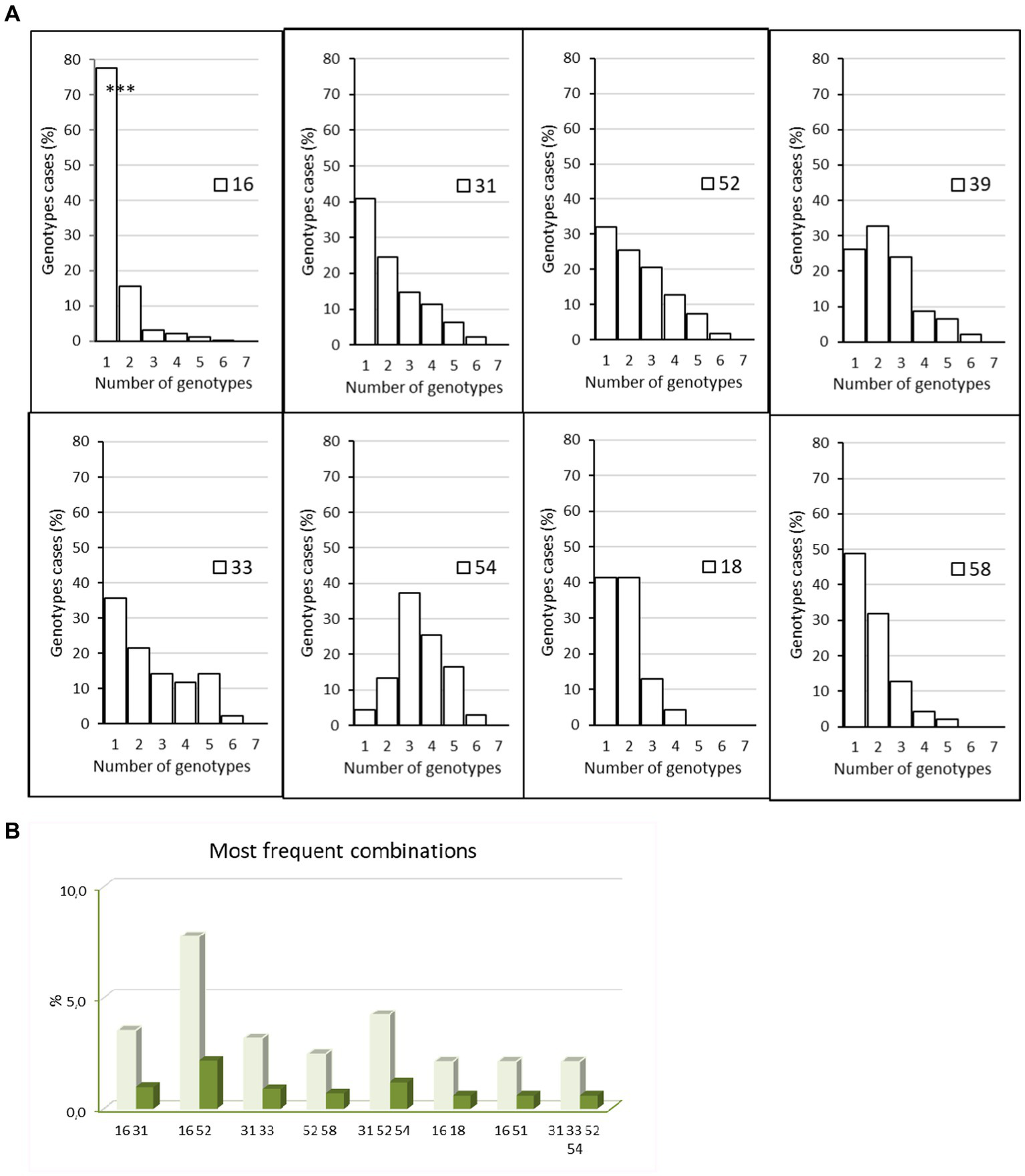 Most coinfections involving HPV 16 were dual infections (84/120, 70%). Of these, only eight involved an LR HPV as a coinfectant (9.5%). We then focused on preferential associations for prevalent genotypes (Supplementary Table S1). For the HR genotypes 18, 58, and 68, a quarter or more of coinfections occurred as follows: HPV18 coinfected with HPV 39 or 16 (36.8% and 23.7% of coinfection cases, respectively), HPV 58 with HPV16 or 52 (27% and 29.7%), and HPV 68 with HPV 39 (25.6%). When coinfected, HPV 16 was most often found with HPV 52 (22% of cases). Interestingly, HPV 33 was infrequently co-infected with the prevalent HPV 16 genotype (7.9%). As expected, low-risk genotypes were poorly represented in this cohort. Only HPV 54 was frequently encountered in association with HPV 52 and 31 (29.9% and 26.2% of cases).